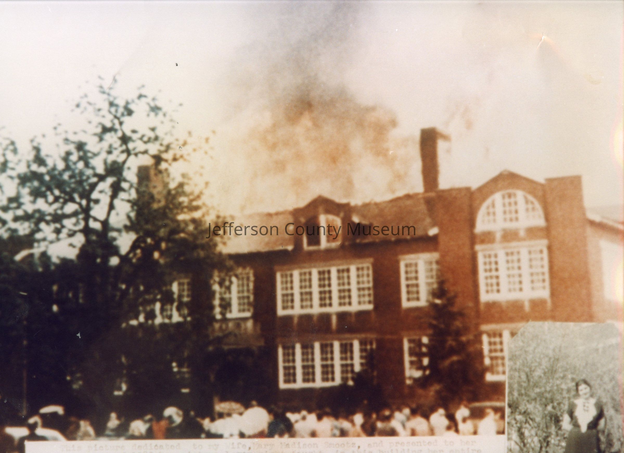 Typed information at bottom of photo reads: "This picture dedicated to my wife, Mary Madison Smootz, and presented to her Christmas of 1989, her picture lower right, taught in this building her entire teaching career, 2nd grade, room 8, 40 years, 1936-1976, the building is shown here being destroyed by fire, her room is scene far left lower floor. For many years known as the Charles Town Graded School, later as Right [sic] Denny. (Built in 1912) Her husband Harry Ovett Smootz, Principals Wright Denny and James Moler"Acquisition