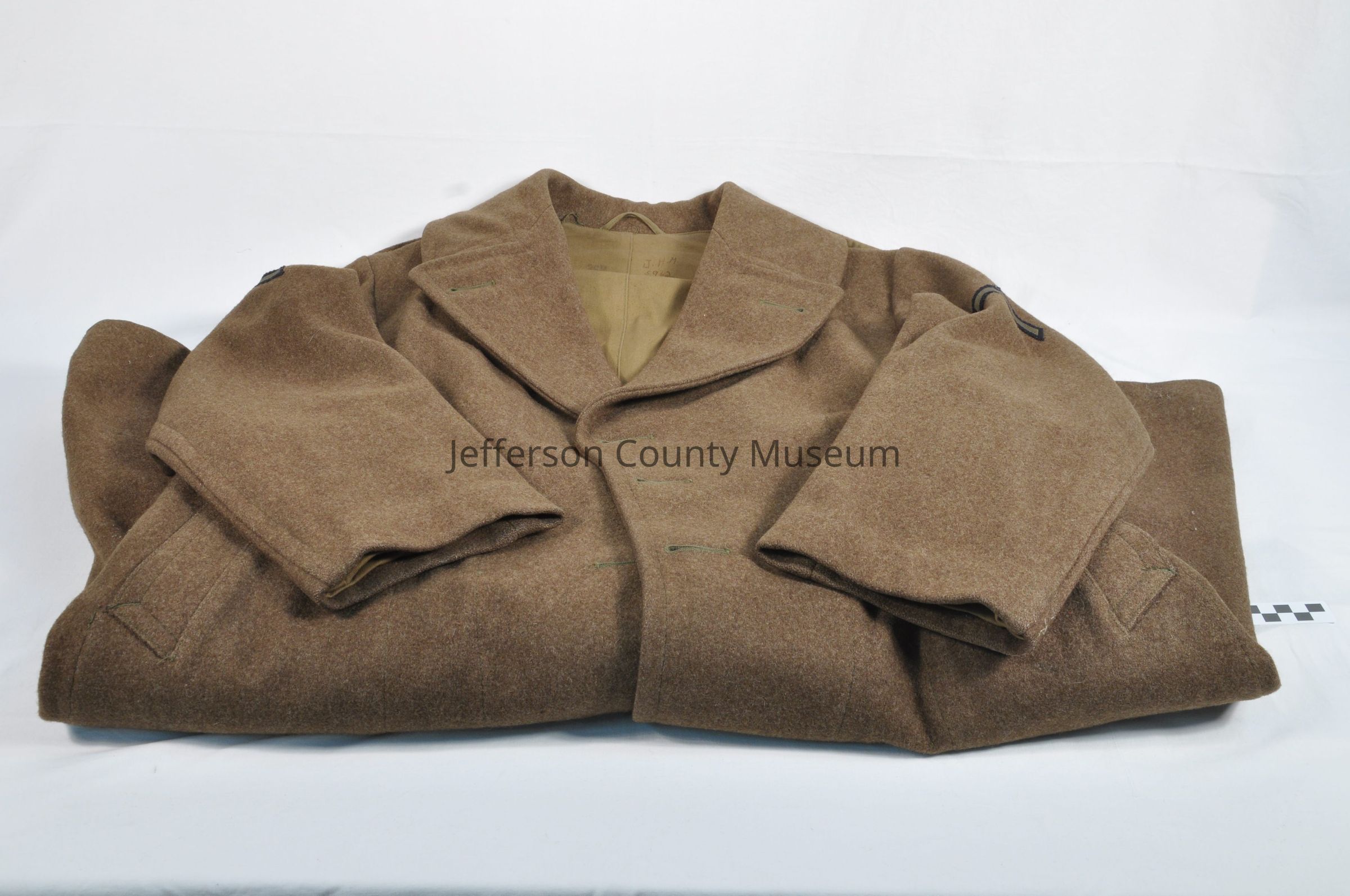 World War II heavy wool OD (olive drab) great-coat with private first class stripes on each sleeve. Buttons have been removed from front,epaulets and belt in back. Two pleats in back. Handwritten inside near collar "J. H. M. 5962".Acquisition