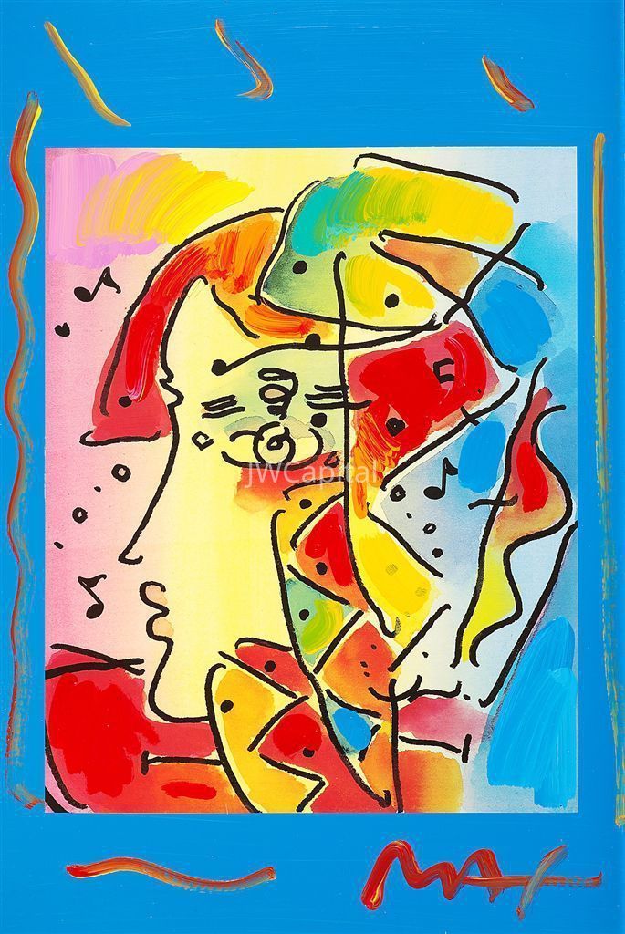 Mixed media painting with acrylic and offset lithography on paper from the Peter Max Studio. Signed in acrylic. A unique work from the artist's studio.