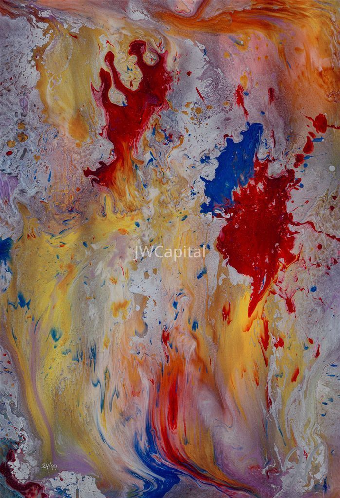 This abstract painting showcases a vibrant explosion of colors, with bold red and orange hues blending into softer yellows and hints of purple and blue, creating a dynamic and fluid composition that suggests motion and energy, as if the colors are dancing across the canvas in a harmonious yet chaotic symphony; the swirling patterns and textured layers add depth and intrigue, inviting the viewer to immerse themselves in the visual journey and explore the emotional resonance of each intertwined pigment, drawing interpretations from the bold and expressive forms that seem to evoke