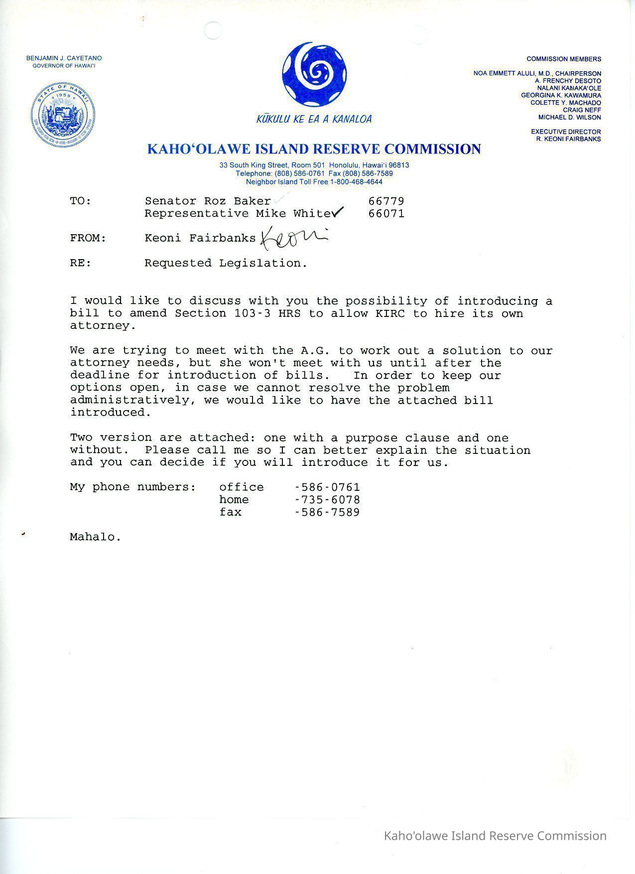 Folder originally filed as part of the Central Files System by the KIRC Administration staff. Contains memo, bill for the KIRC attorney bill (allow the KIRC to retain an attorney without the attorney being a deputy attorney genera), as well as testimony and standing committee report.Collection