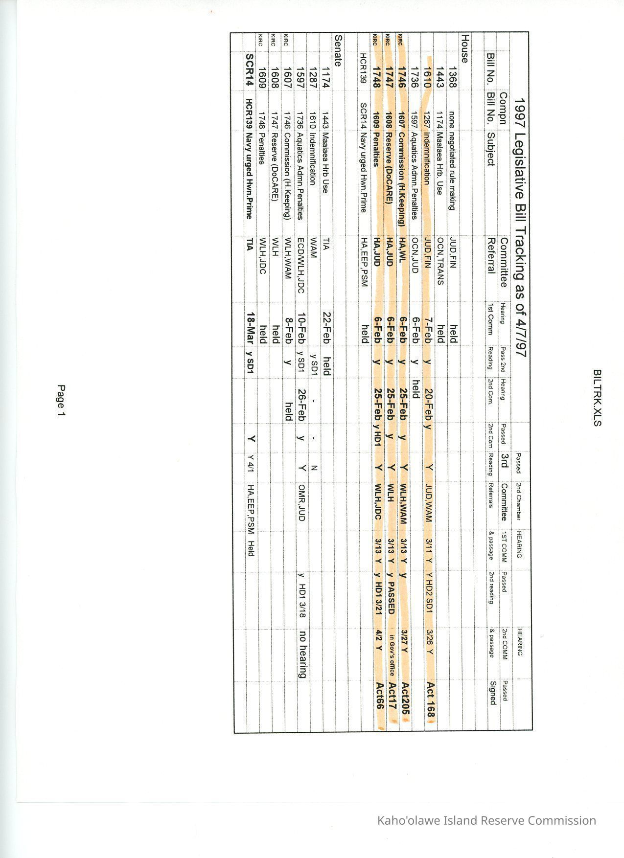 Excel spreadsheet for 1997 Legislative Bill Tracking as of 4/7/97. Certain rows in the House section are highlighted in orange.Collection