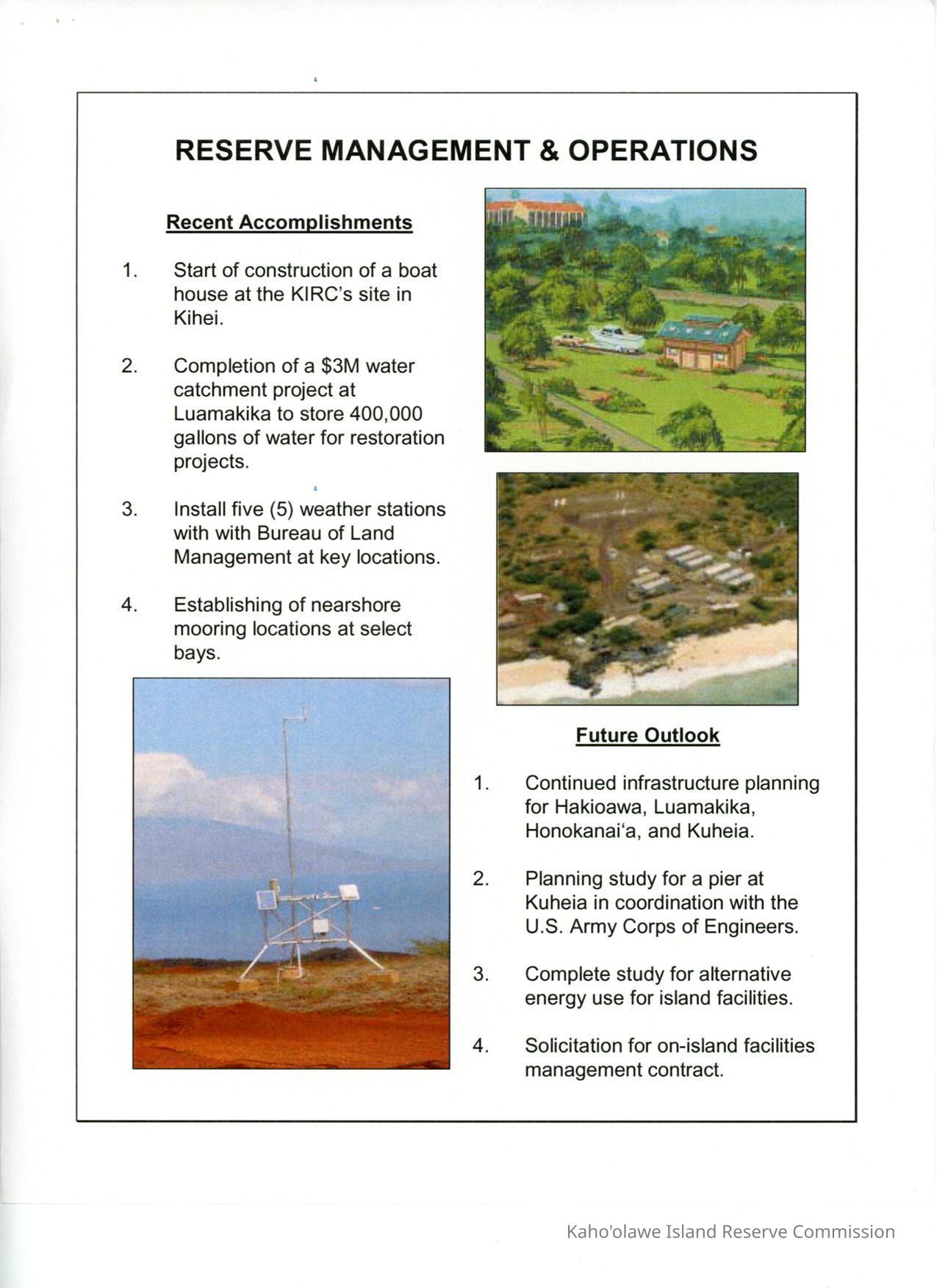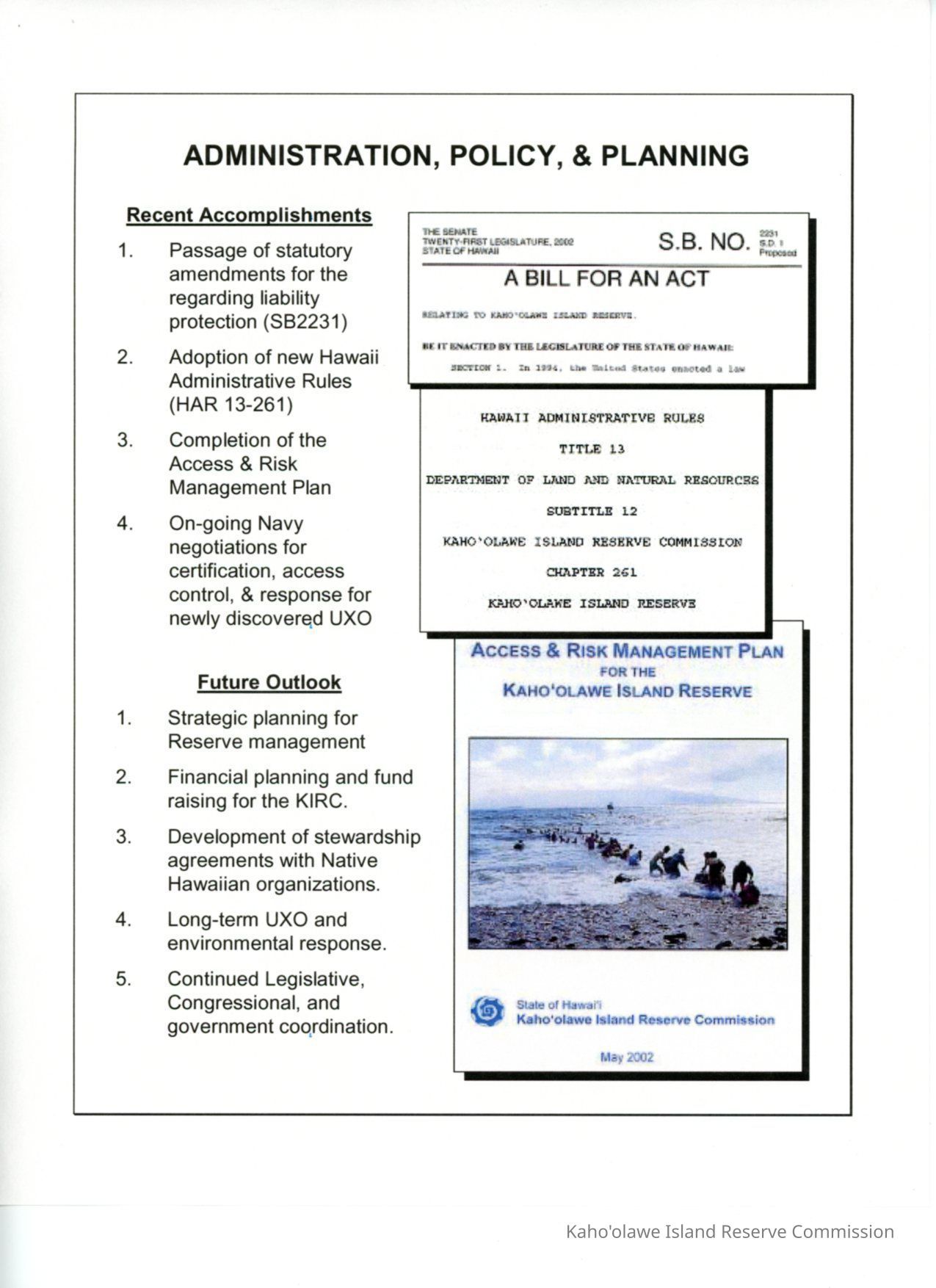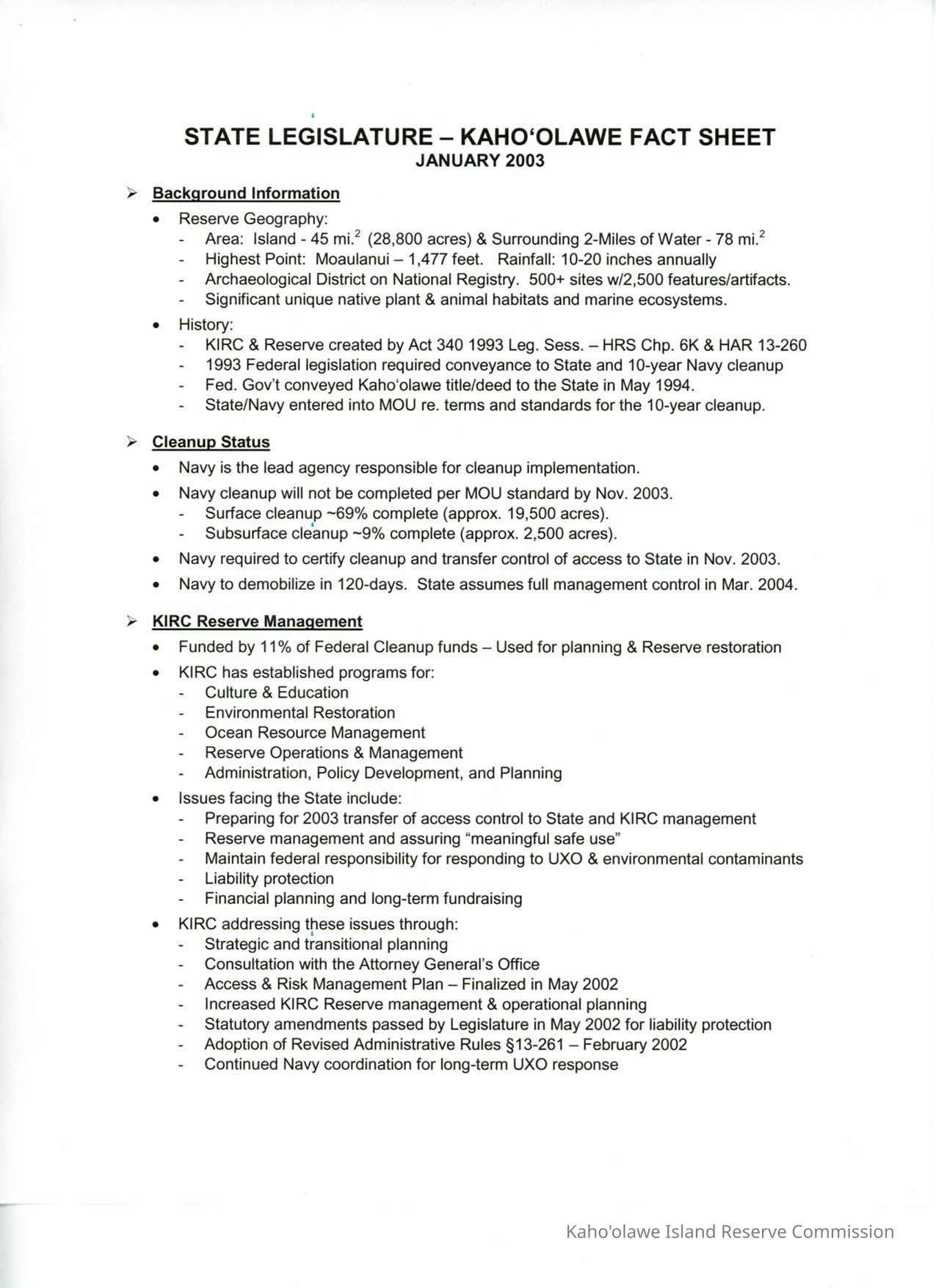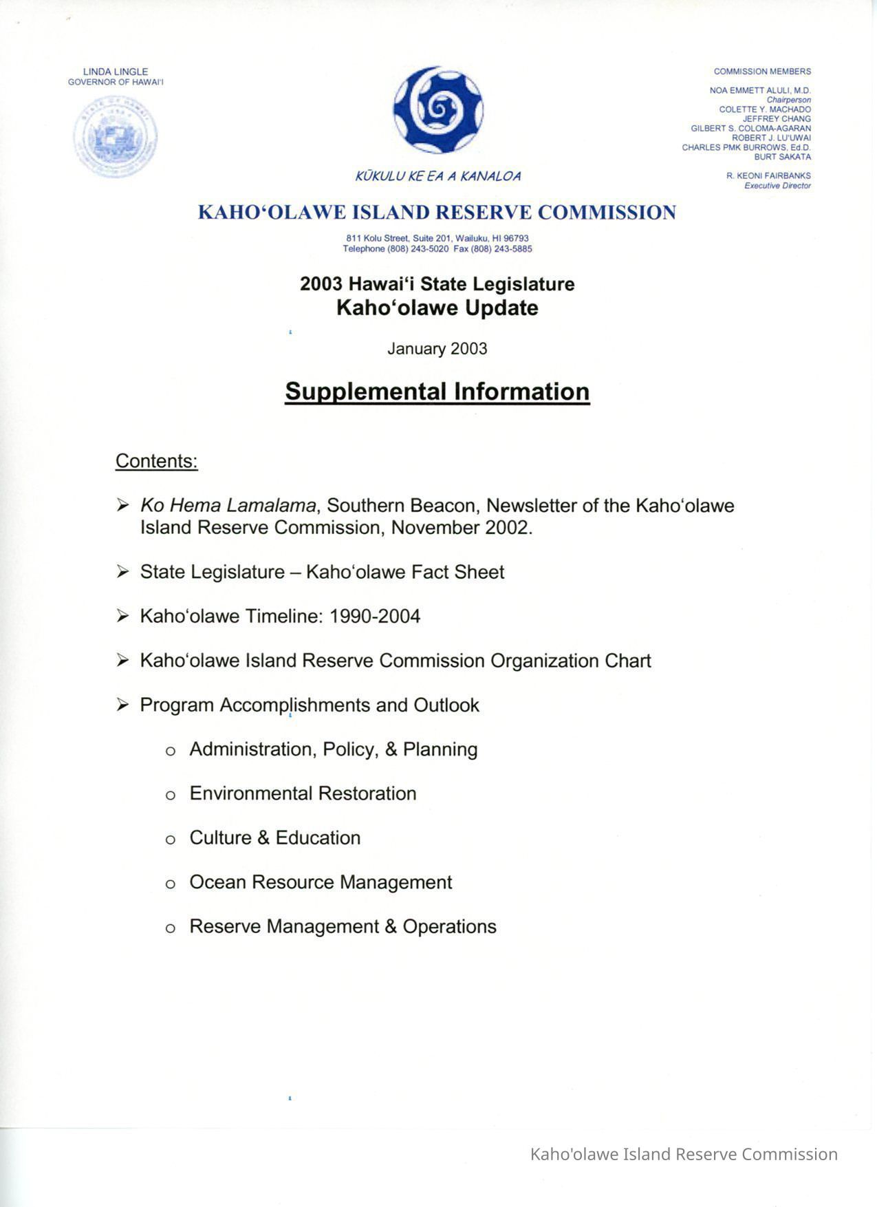 2003 Hawai'i State Legislature, Kaho'olawe Update, January 2003, Supplemental Information. Color document.Date(s) of Creation