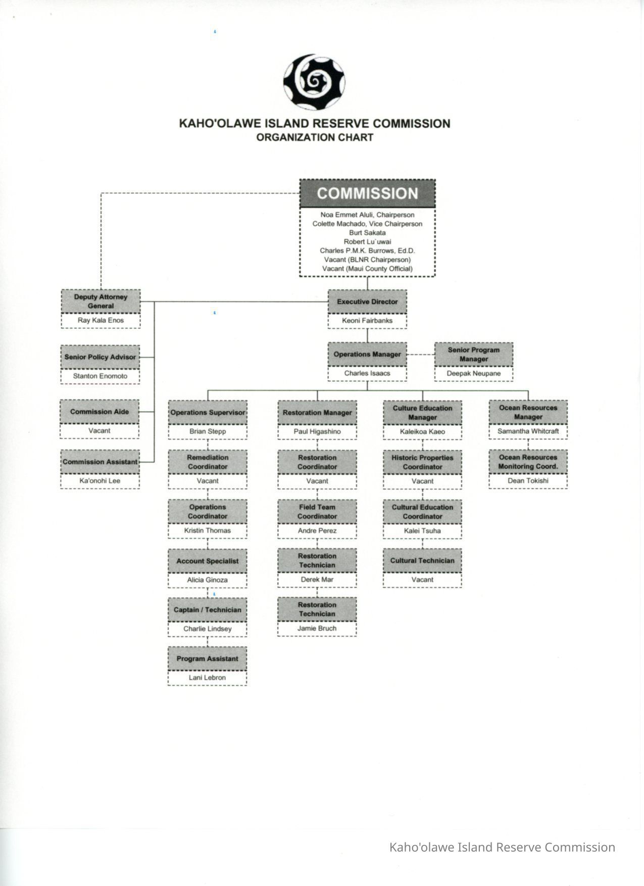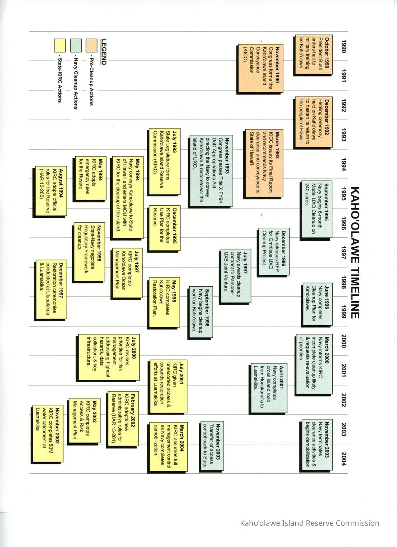 2003 Hawai'i State Legislature, Kaho'olawe Update, January 2003, Supplemental Information. Color document. Contents: Kaho'olawe Fact Sheet, Kaho'olawe Timeline, Kaho'olawe Island Reserve Commission Organization Chart, Program Accomplishments and Outlook.Collection