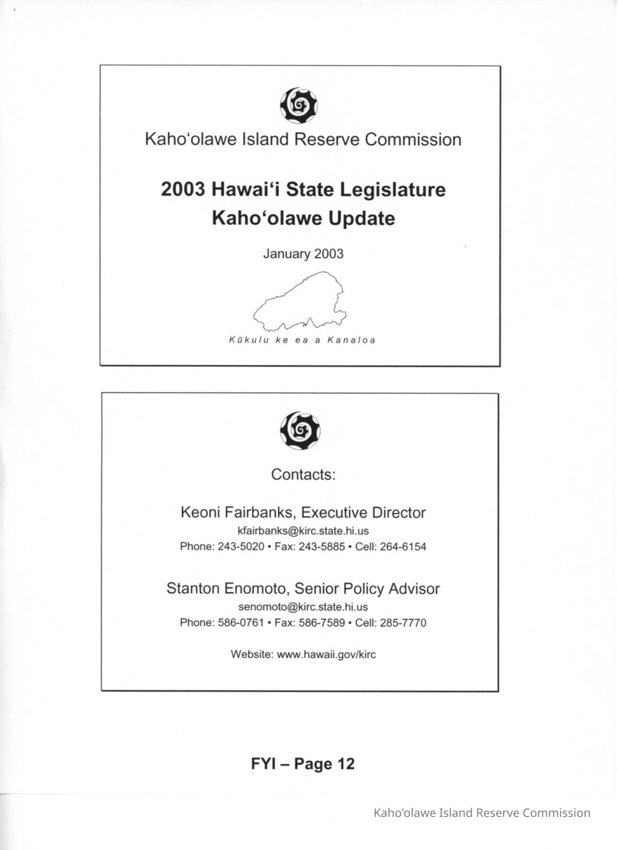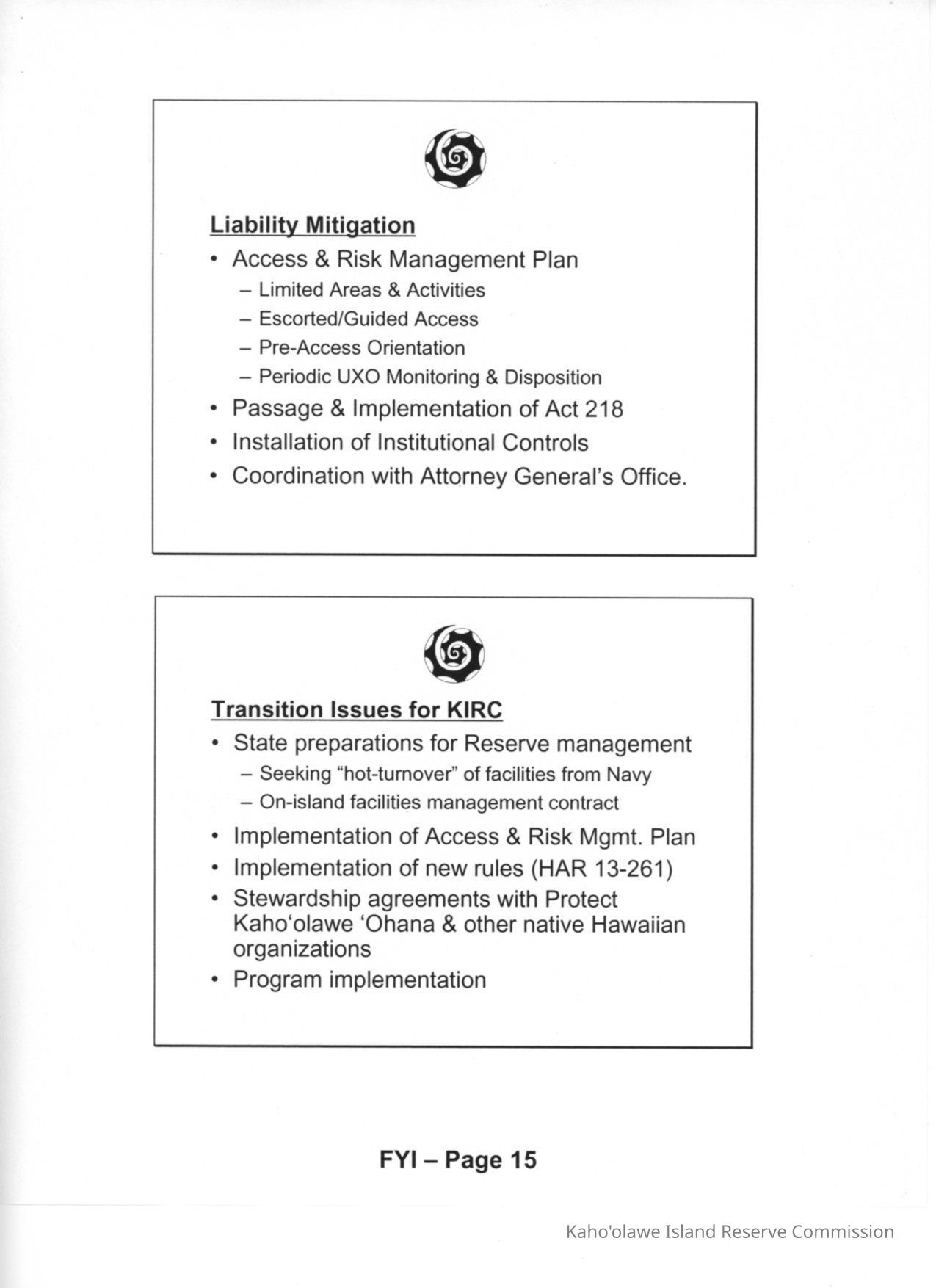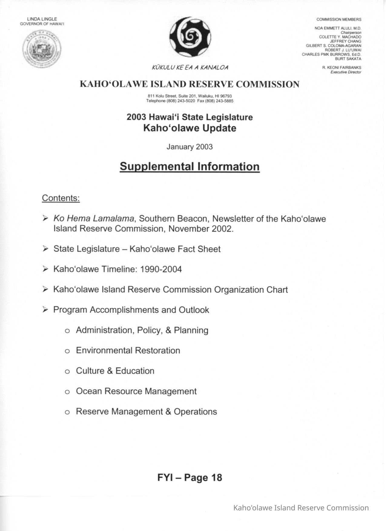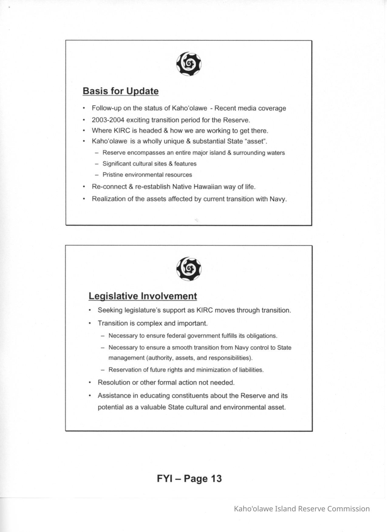 Kaho'olawe Island Commission, 2003 Hawai'i State Legislature Kaho'olawe Update, January 2003. PowerPoint document, black & white copy.Creator