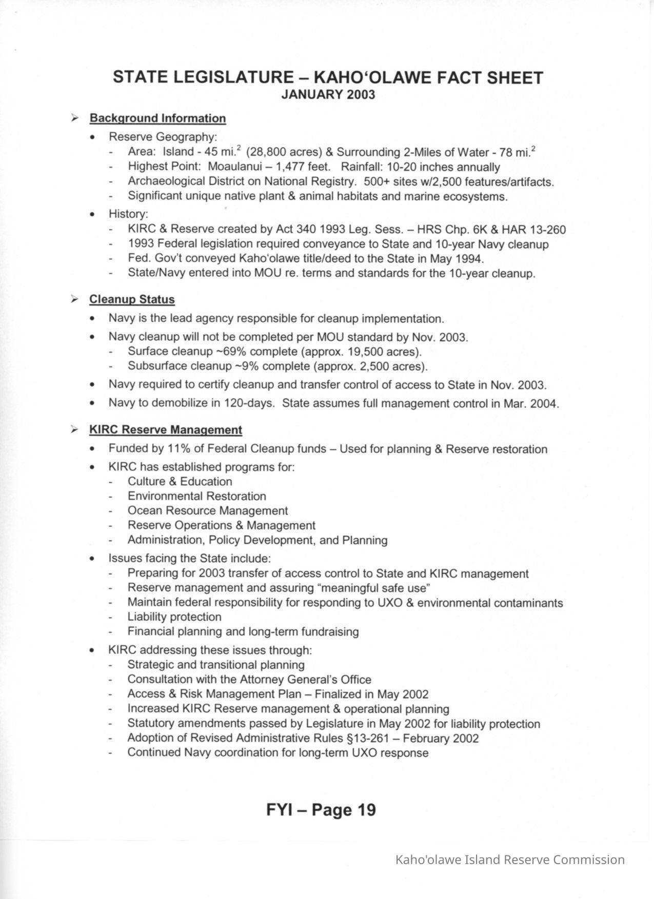 2003 HI State Legislature Kaho'olawe UpdateEntry/Object ID