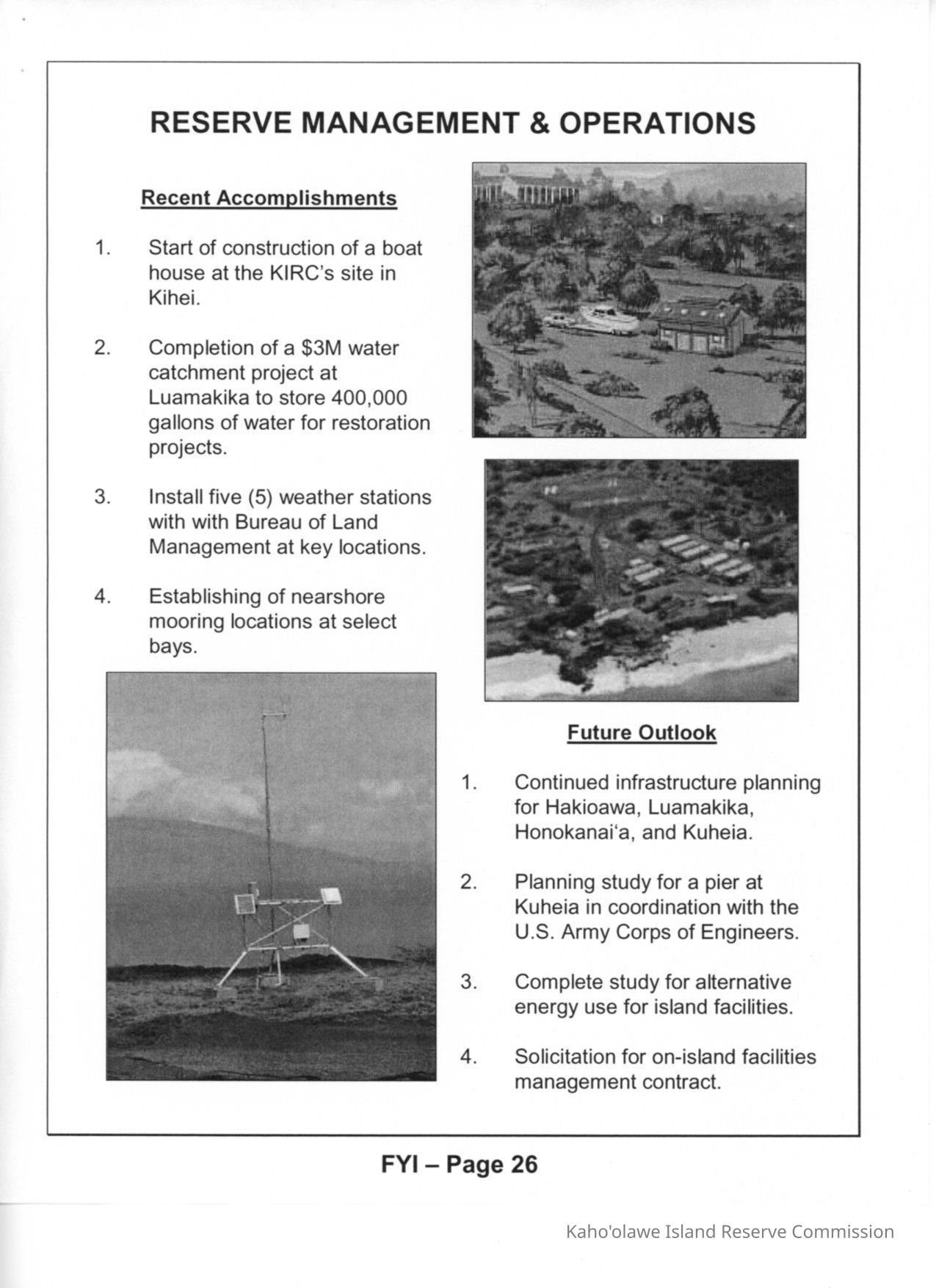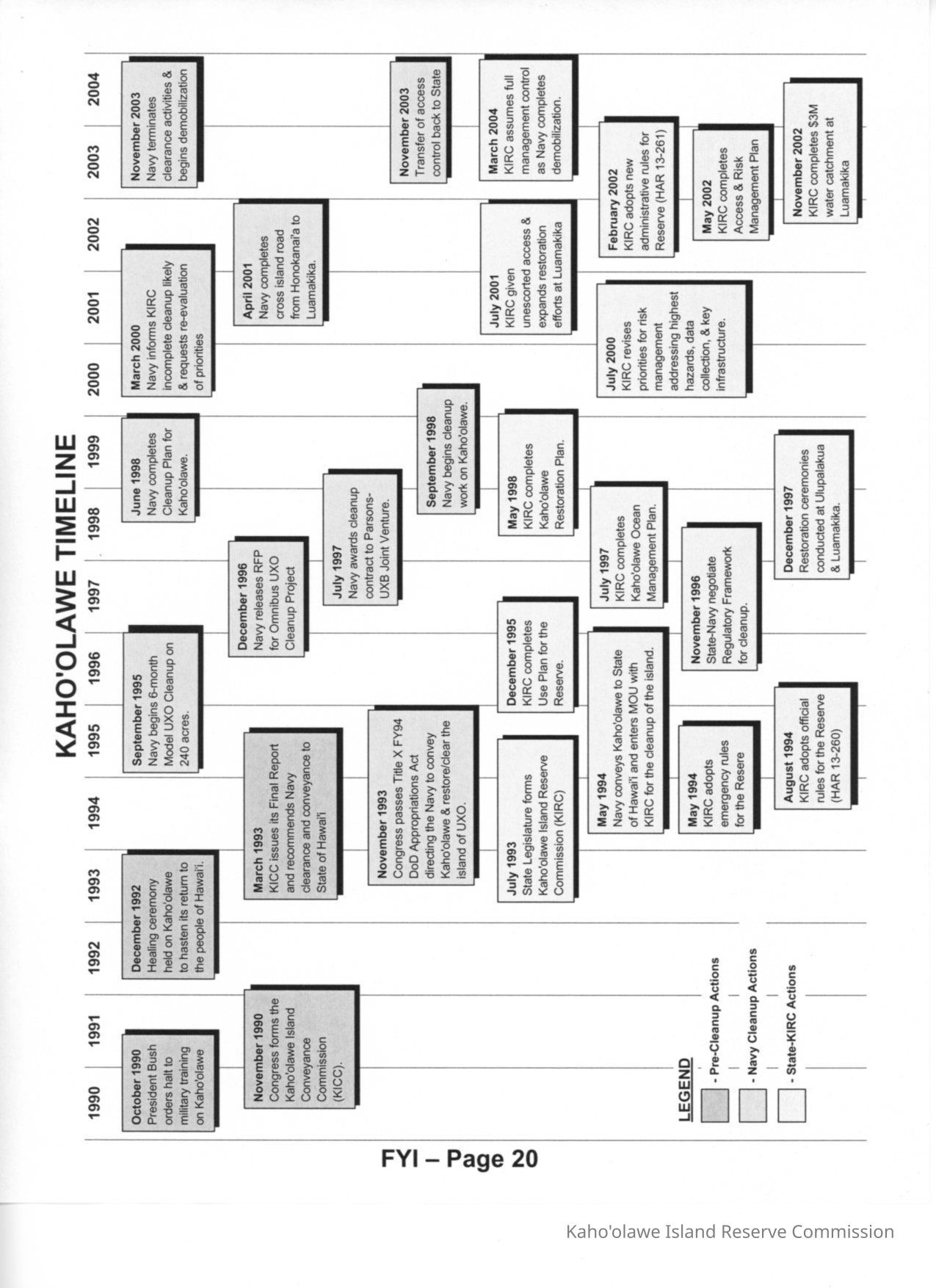 Follow-up on the status of Kaho'olawe. Contains information about legislative involvement, cleanup, liability mitigation, transitions issues for the KIRC, trust fund summary, financial planning & fundraising, commission & staff summary, supplemental information: Kaho'olawe Fact Sheet, Kaho'olawe Timeline, KIRC organization chart, program accomplishments & outlook.Collection