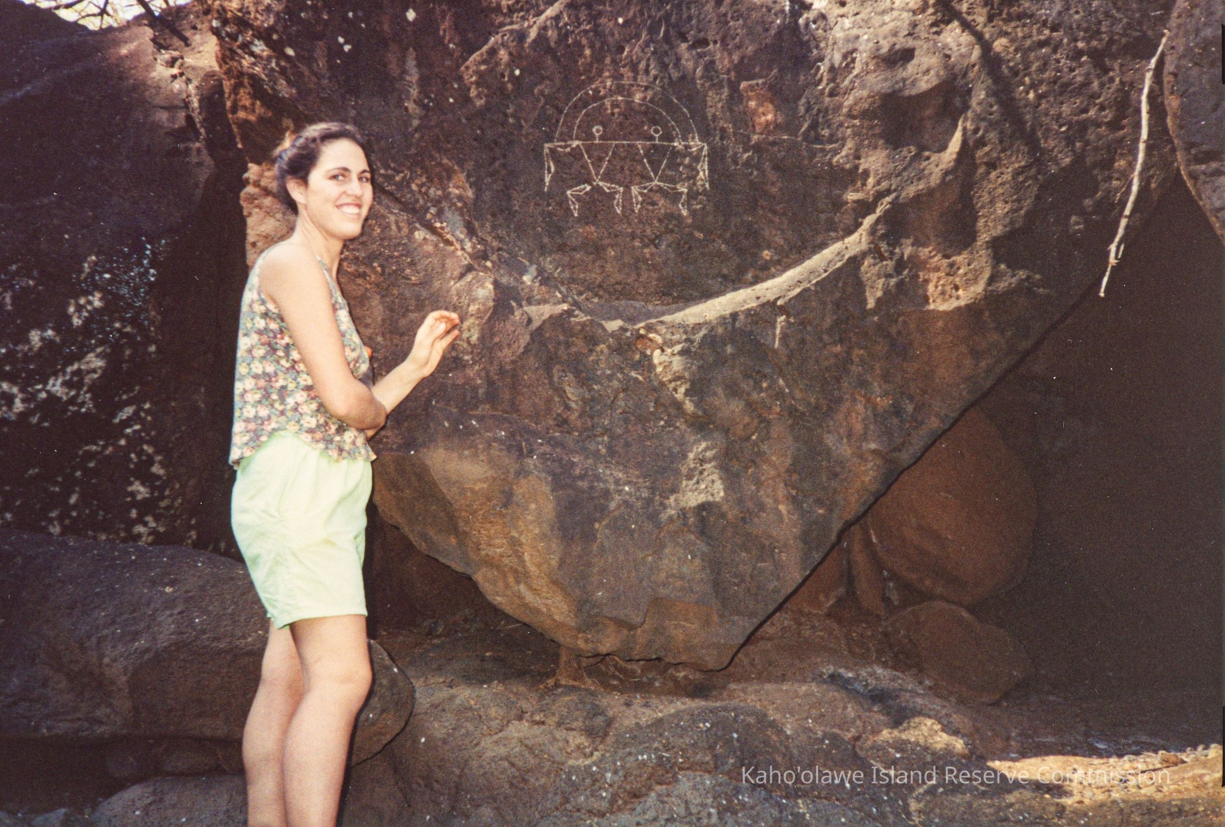 A woman stands smiling near a large rock face that features a petroglyph, showcasing intricate carvings of geometric shapes and figures.