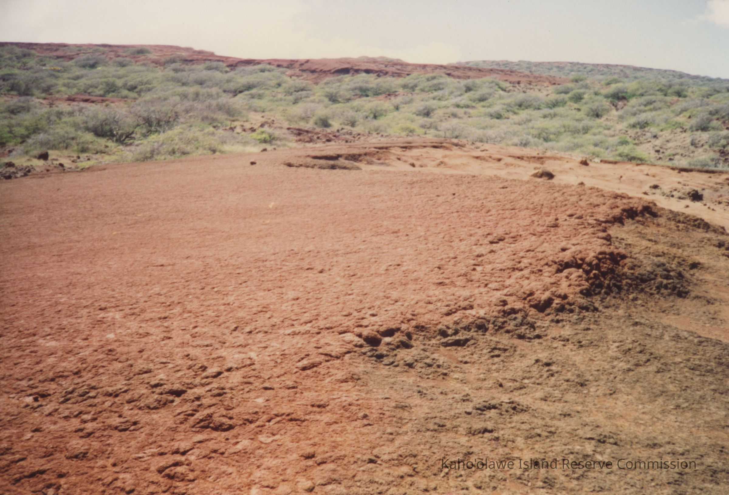 The image depicts an expansive area of hardpan with dry, cracked earth, bordered by sparse vegetation and distant hills under a clear sky.