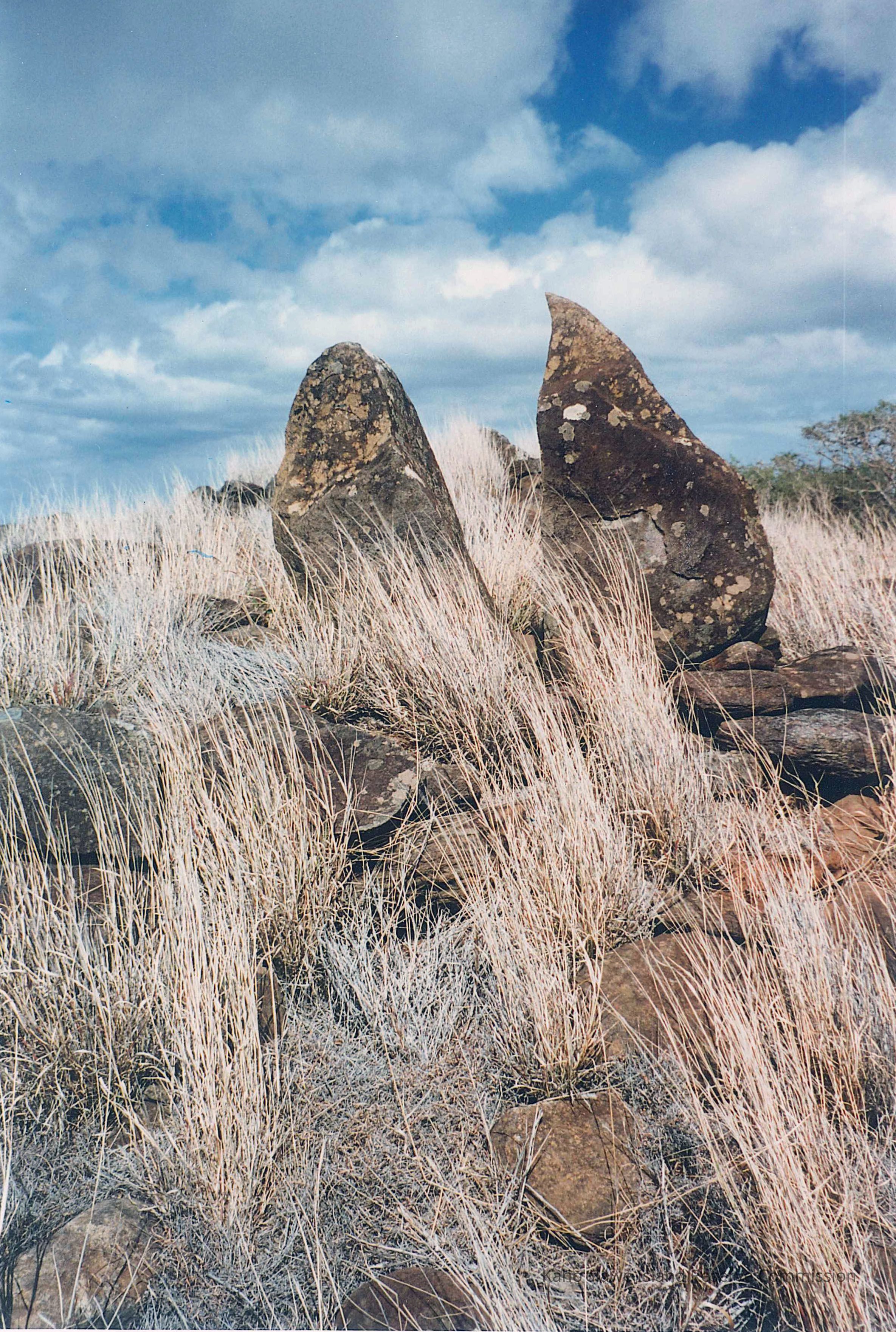 Color photo of Pu‘umōiwi Shrine amongst grass.