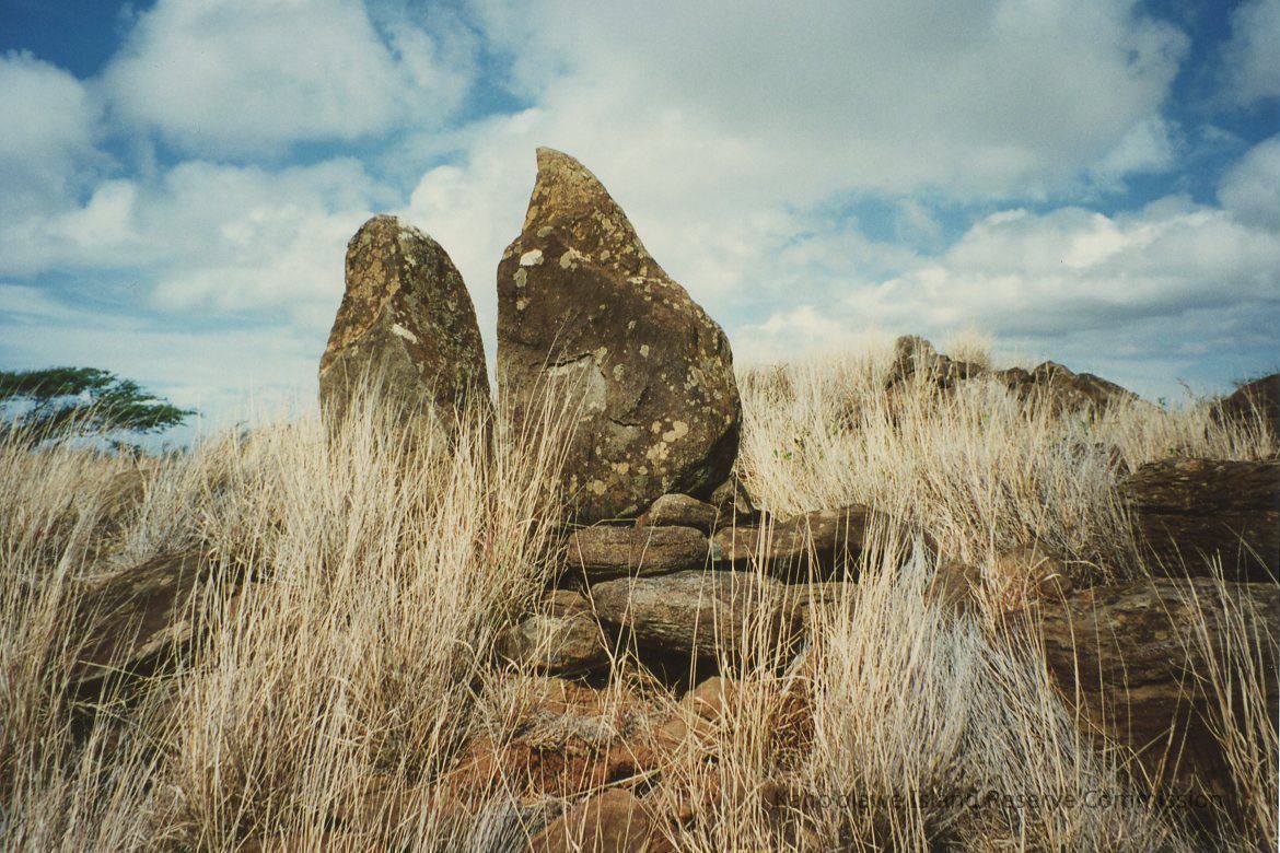 This image captures a shrine made of upstanding pohaku emerging from a field of tall, dry grass against a backdrop of blue sky with fluffy clouds.