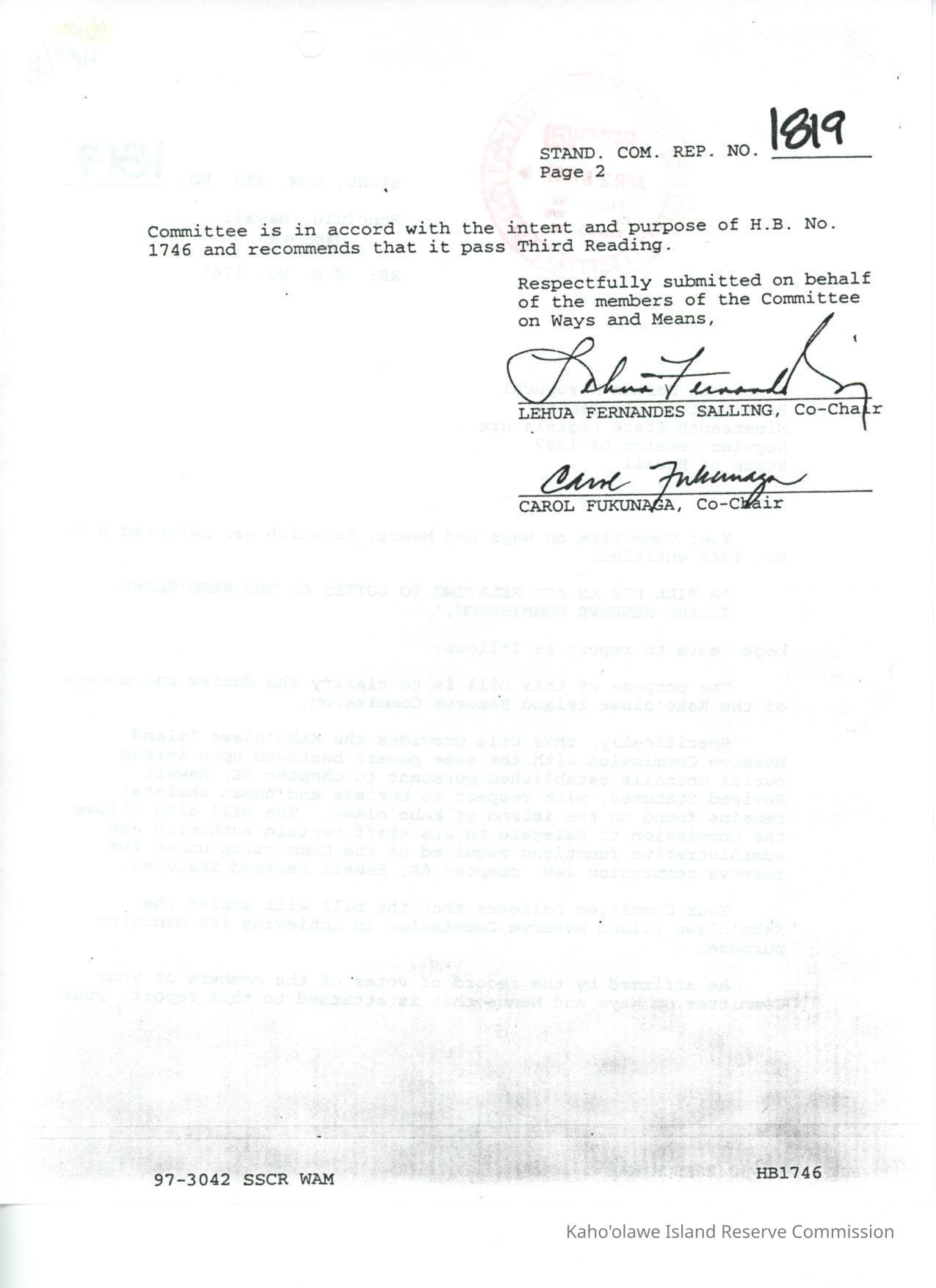Standing Committee Report No. 1819 re: H.B. No. 1746, "A Bill for an Act Relating to Duties of the Kaho'olawe Island Reserve Commission." 2 copied pages (back to back)Creator