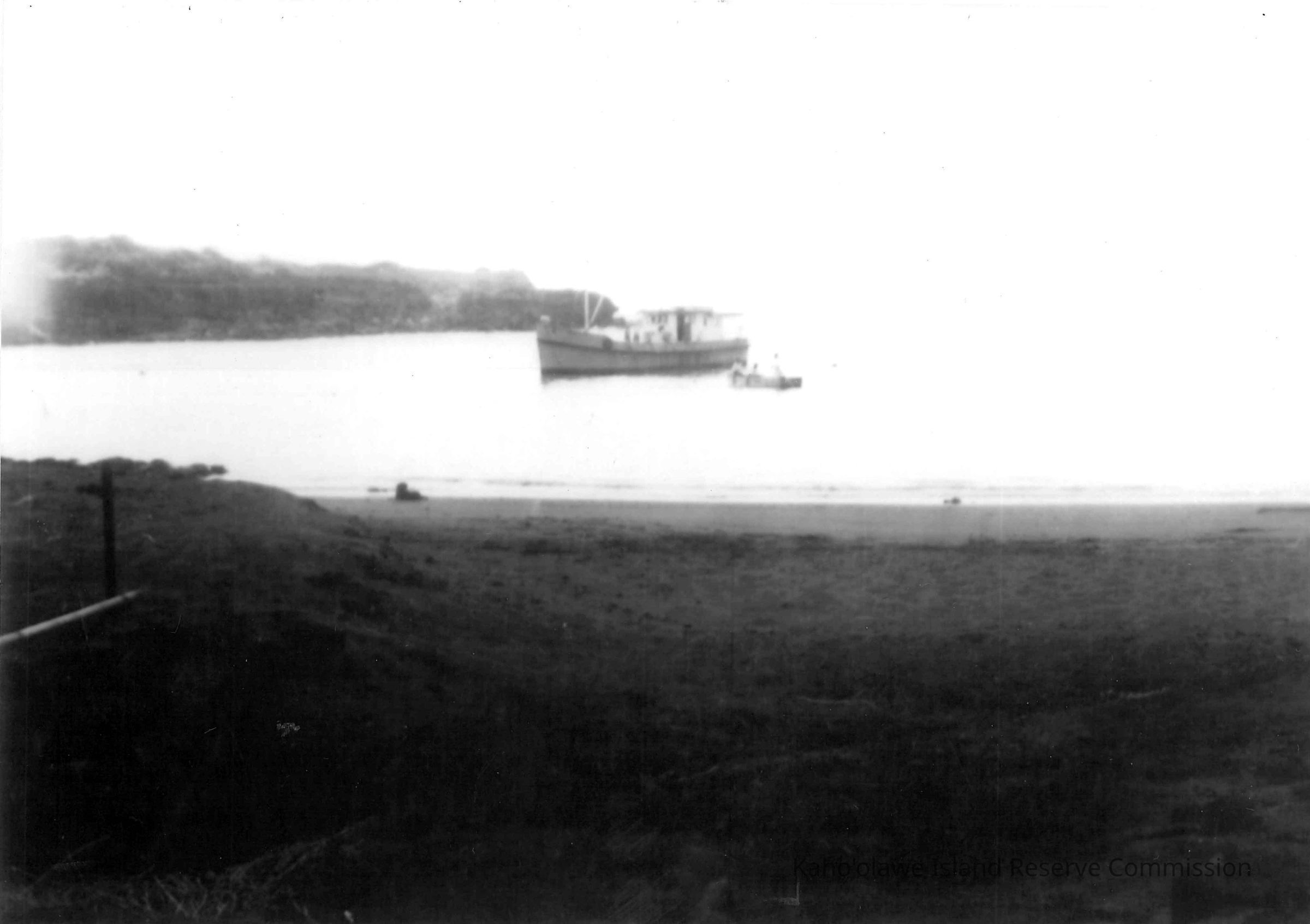 The black and white image depicts s small boat heading towards to a ship anchored off a coast, against a faintly visible landscape.