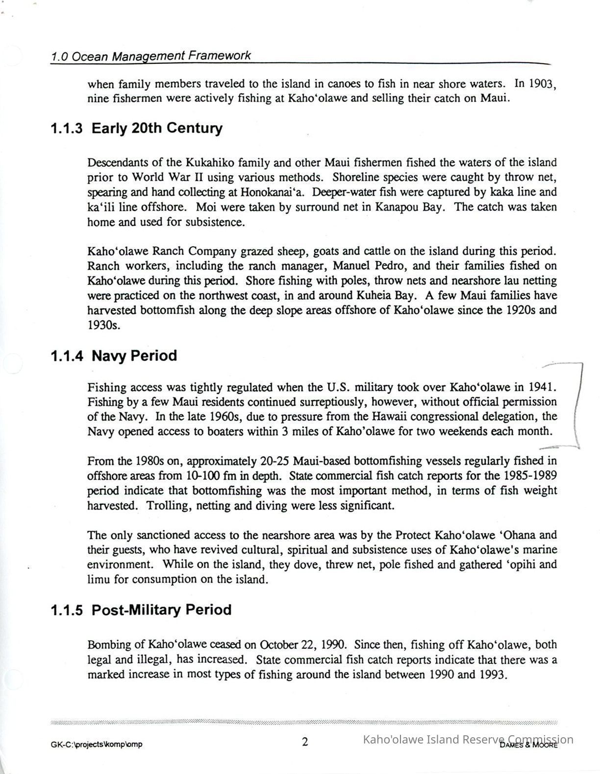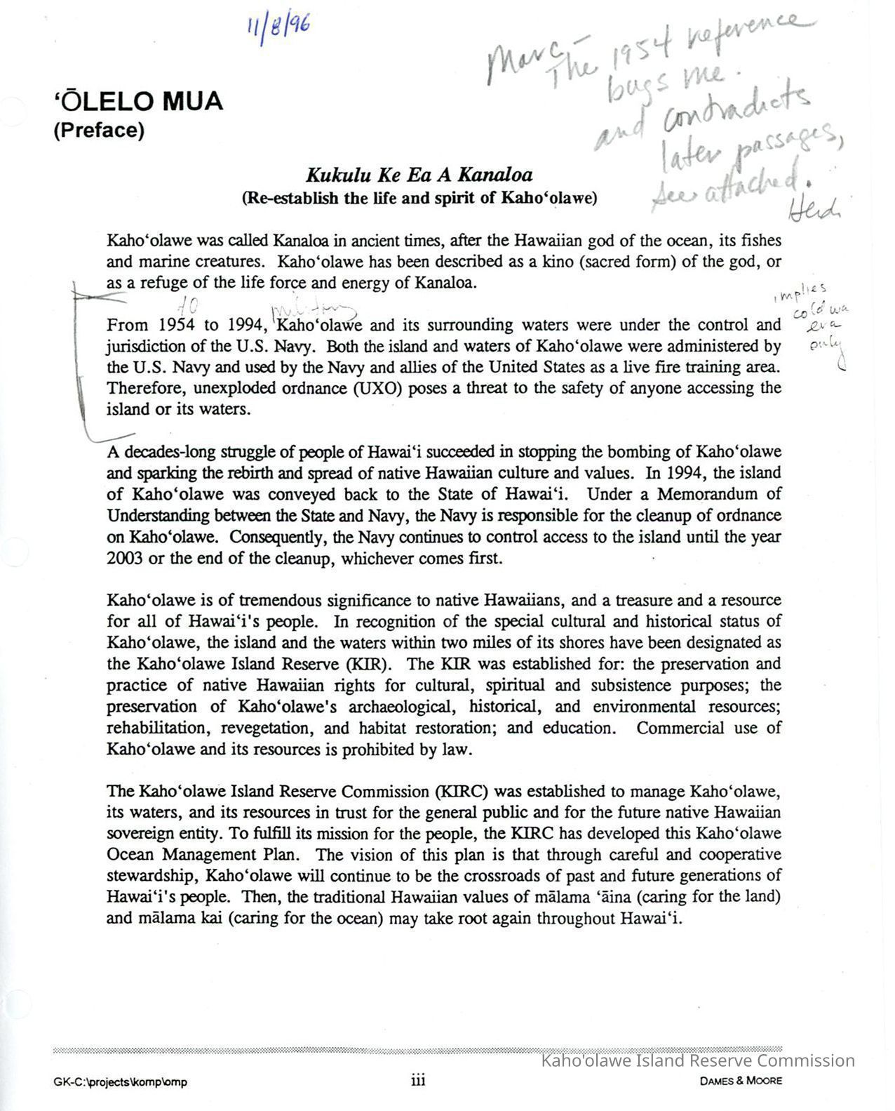 ʻŌlelo Mua (Preface) (of the Draft Ocean Management Plan?), Kukulu Ke Ea A Kanaloa (Re-establish the life and spirit of Kaho'olawe) with hand-written notes. Two copied pages.Creator