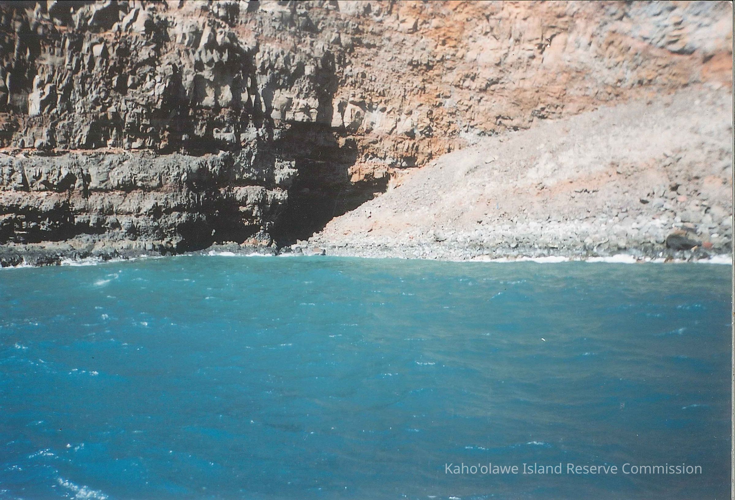 The image displays a majestic coastal scene featuring vibrant blue waters against rugged, stratified cliff walls and a sparse pebbly beach.
