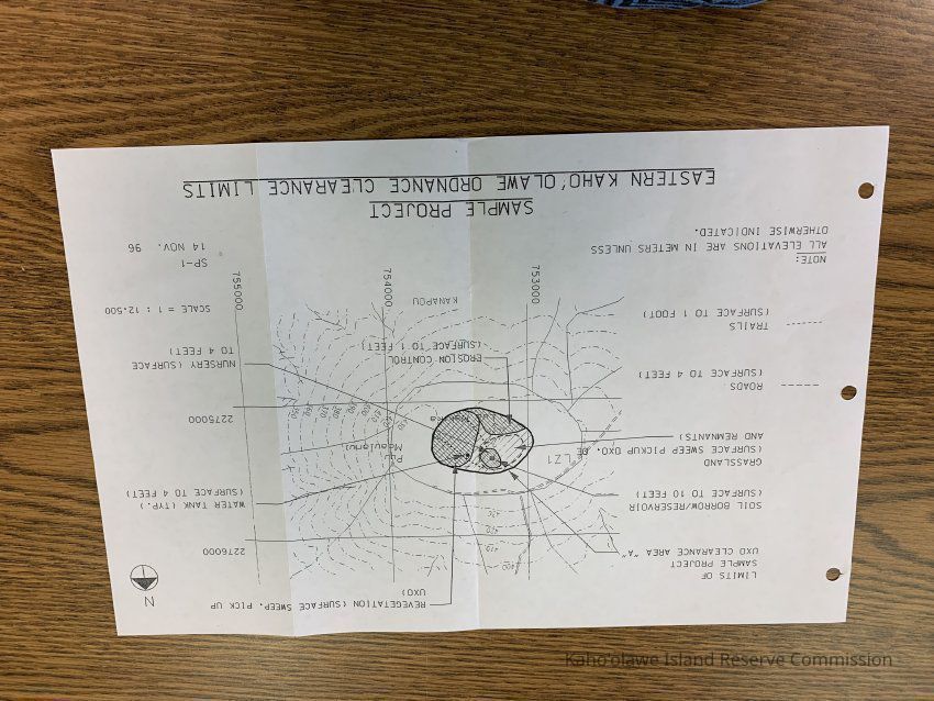 Map of Sample Project, Eastern Kahoolawe Ordnance Clearance Limits. Map of Luamakika and location of grassland, tails, roads, erosion control and water tank.Collection
