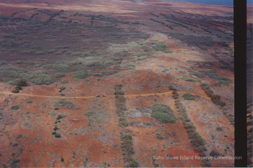 A high altitude aerial photo of K-1 Road past LZ 1 going towards the summit (Pu'u O Moa'ula Nui) with Luamakika in the background.Collection