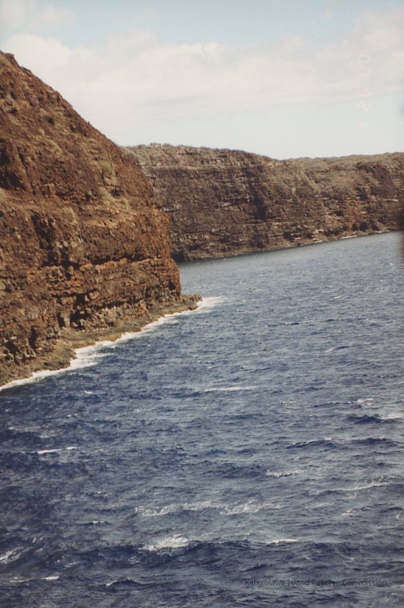 The image depicts a rugged coastline with steep cliffs over a choppy blue sea, captured under a clear sky.