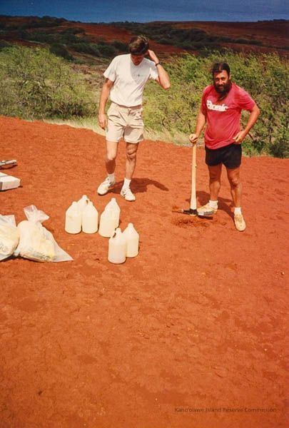 Color photograph of two unidentified kāne (men) (possibly Thomas Giambellucca on the left) standing on hardpan terrain. One is looking down and the other is holding a pickaxe. There are bottles and bags laying on the ground in front of them.
