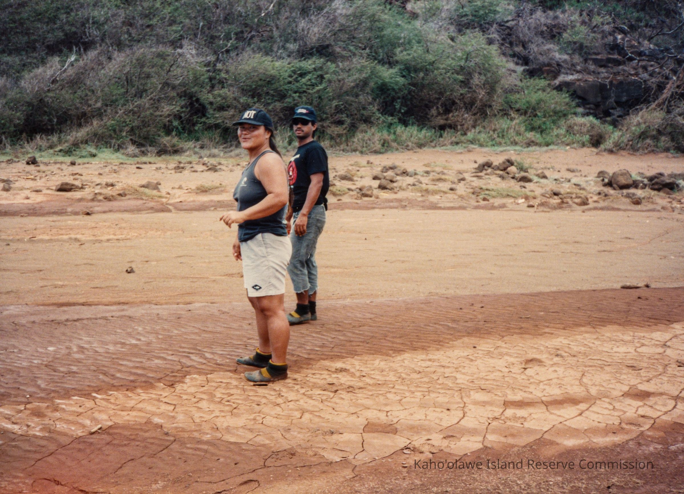 Two people, wearing casual outdoor clothing and hats, stand on dry cracked earth with rocky terrain and greenery in the background.