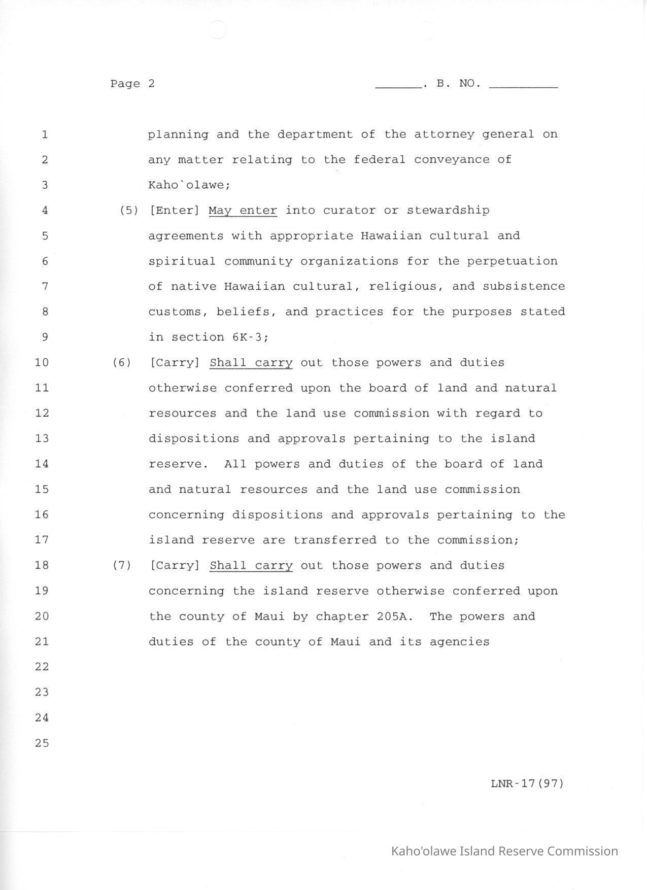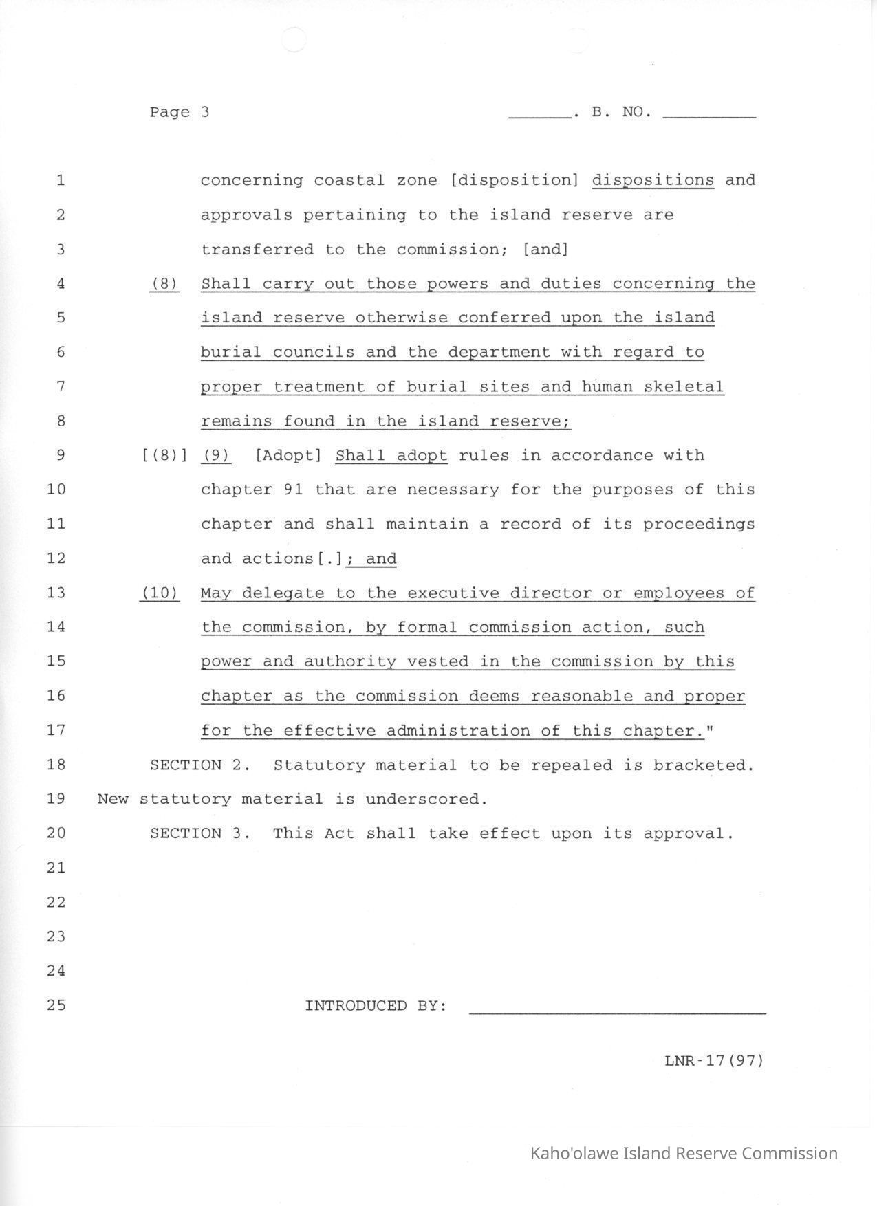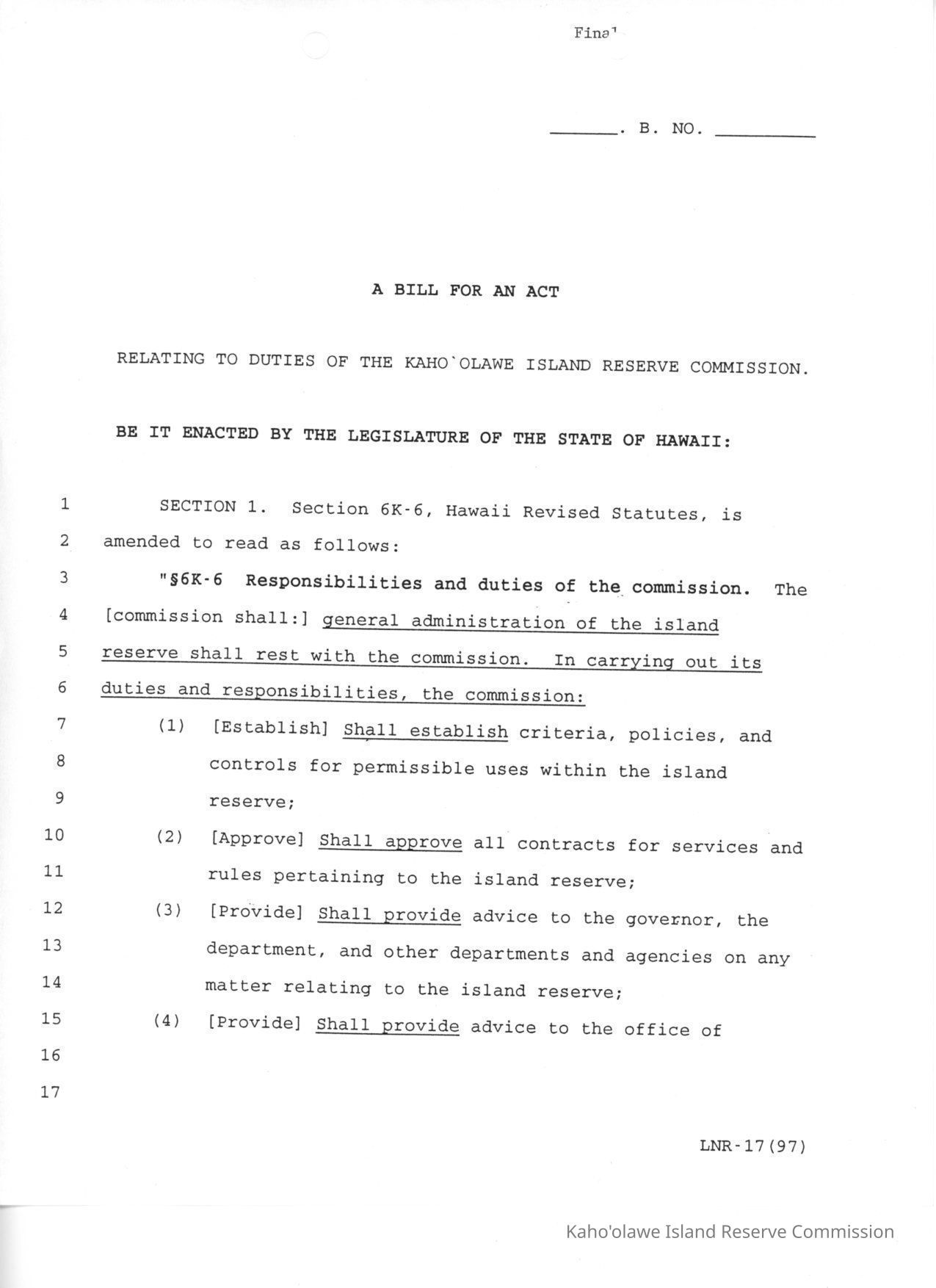 A Bill for an Act, Relating to Duties of the Kaho'olawe Island Reserve Commission. "Final" typed at top and Footer-LNR-17(97). Excerpts: "general adminstration of the island reserve shall rest with the commission . . ." "May delegate to the executive director or employees of the commission, by formal commission action, such power and authority vested in the commission by this chapter as the commission deems reasonable and proper for the effective administration of this chapter."Collection