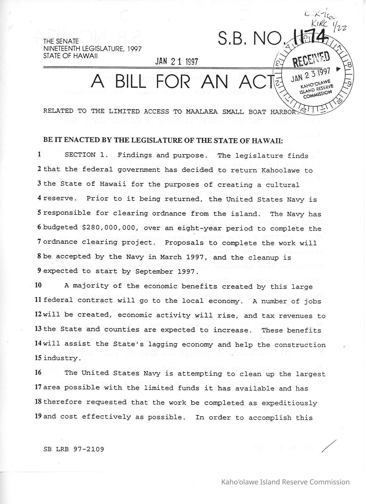 S.B. No. 1174, A Bill for An Act, Related to the Limited Access to Maalaea Small Boat Harbor (SB LRB 97-2109). Permits the U.S. Navy to use Maalea small boat harbor to transport work crews to conduct the cleanup of ordnance on Kahoolawe.Collection