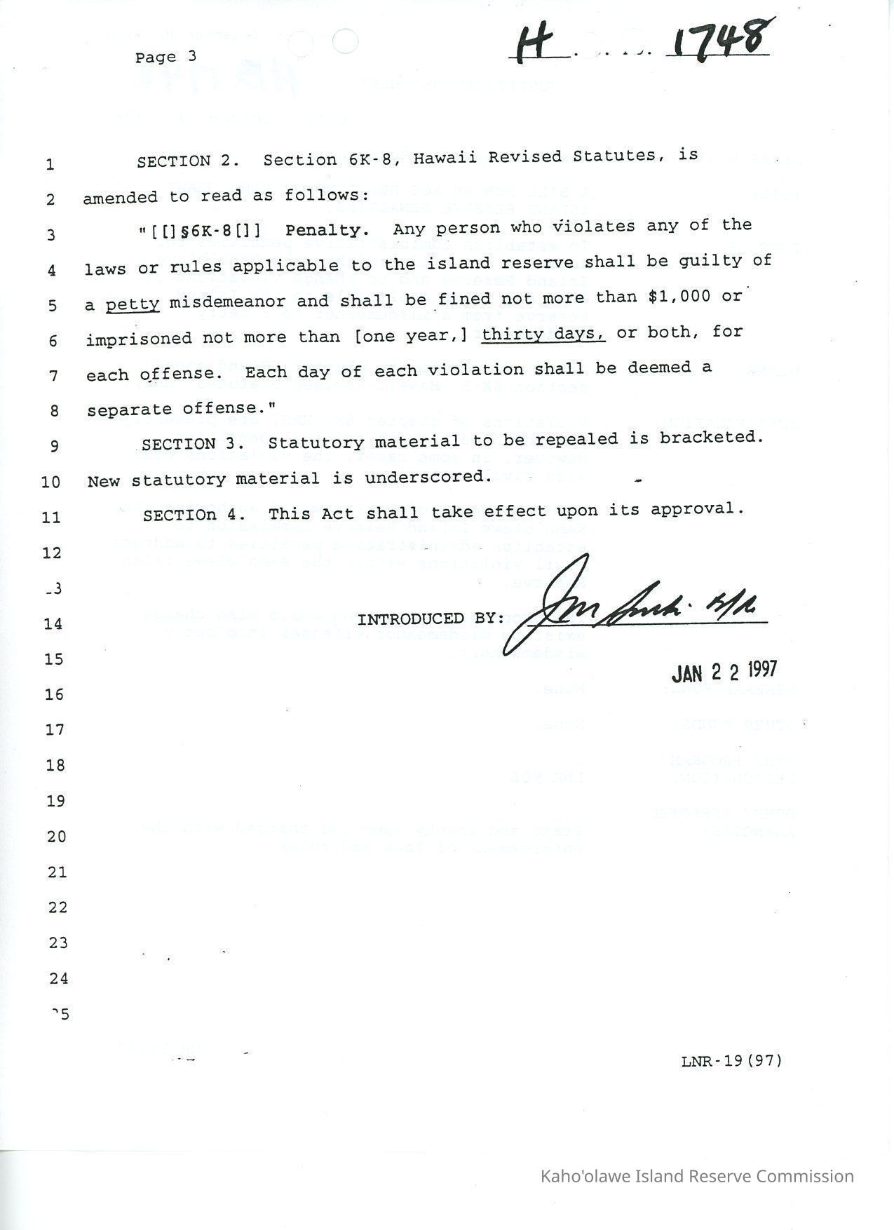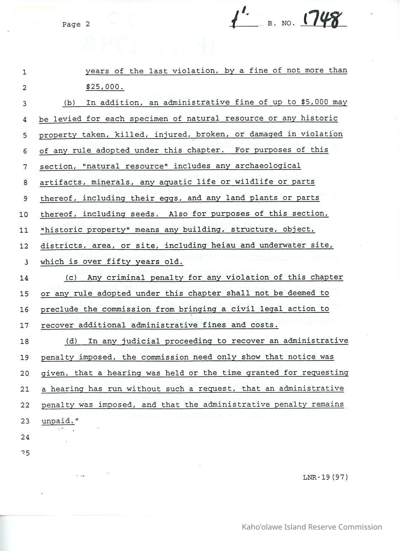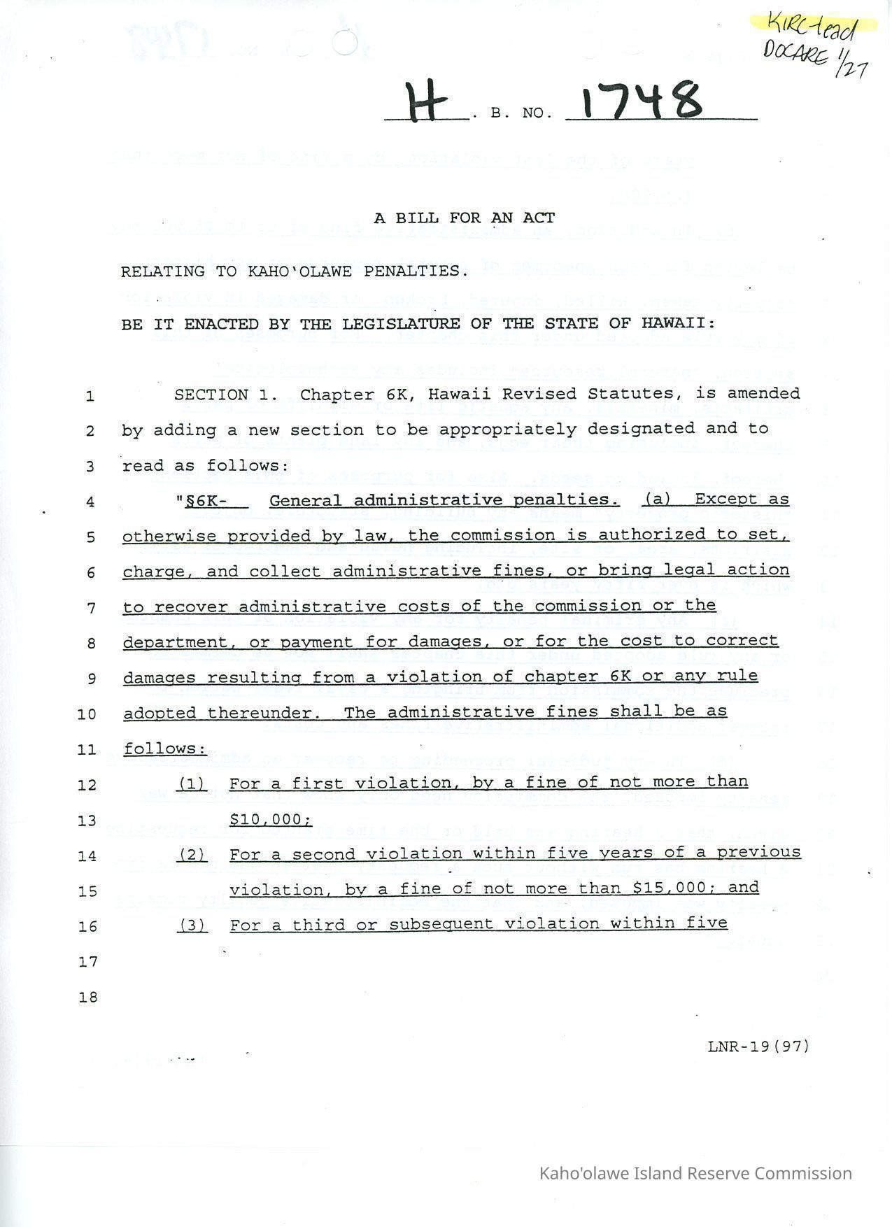 H.B. No. 1748, A Bill for an Act, Relating to Kaho'olawe PenaltiesCreator