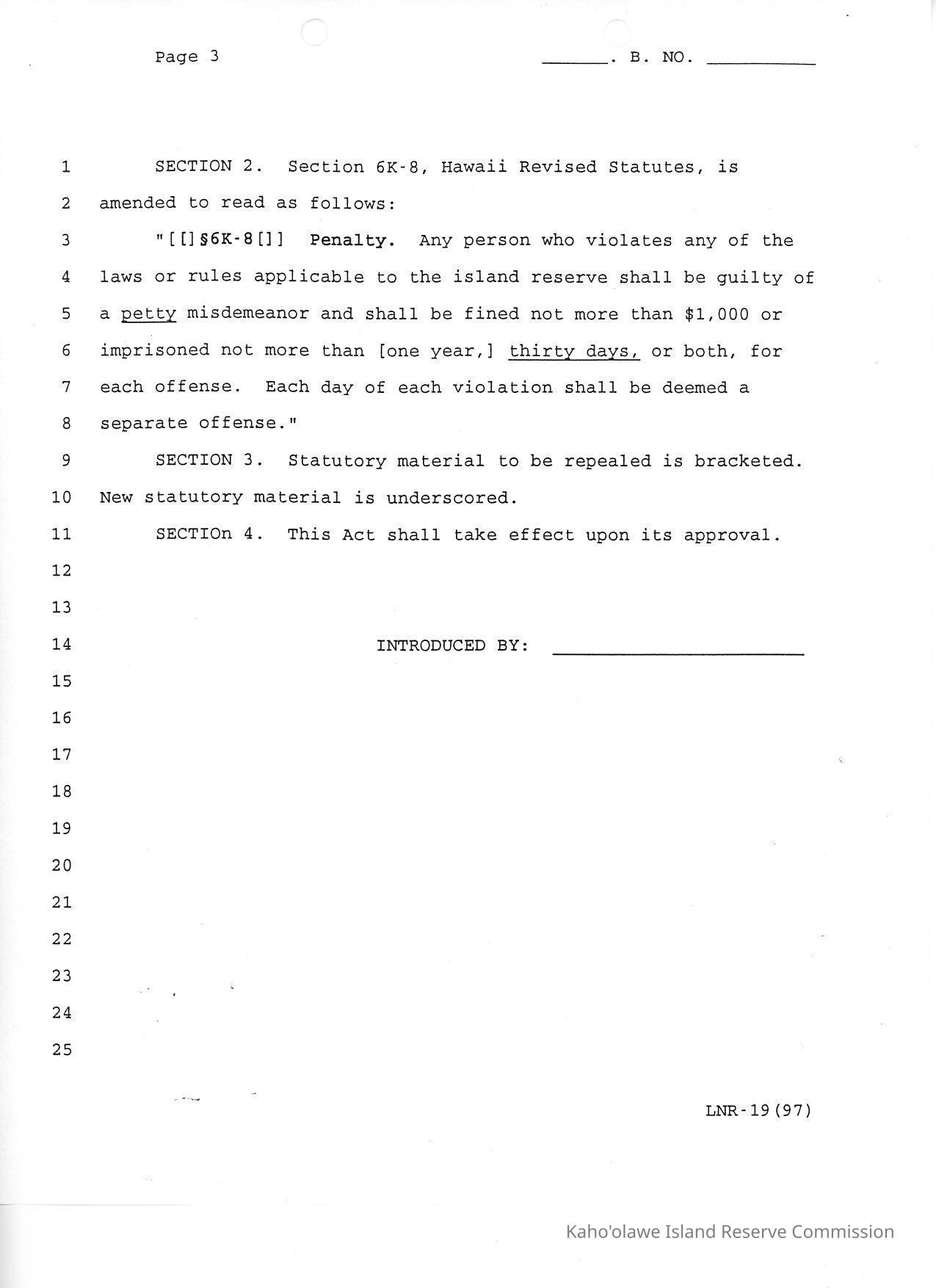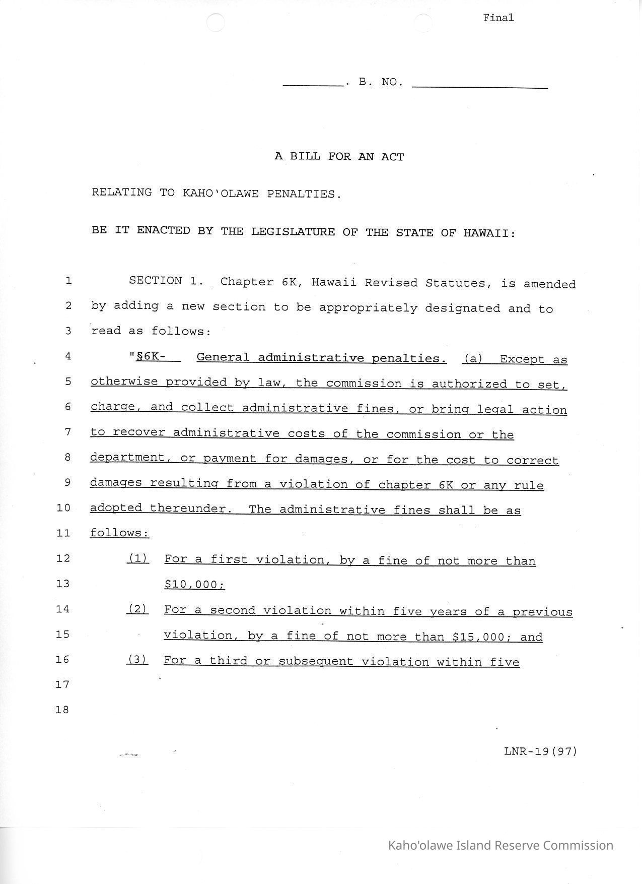A Bill for an Act, Relating to Kaho'olawe Penalties. "Final" typed at top of first page. Footer LNR-19 (97). Originally paperclipped to Justification Sheet (KIRC Object ID #2014.015.54) and A Bill for an Act, Relating to Penalties for Violations of Laws or Rules Applicable to the Kaho'olawe Island Reserve (KIRC Object ID #2014.015.53).