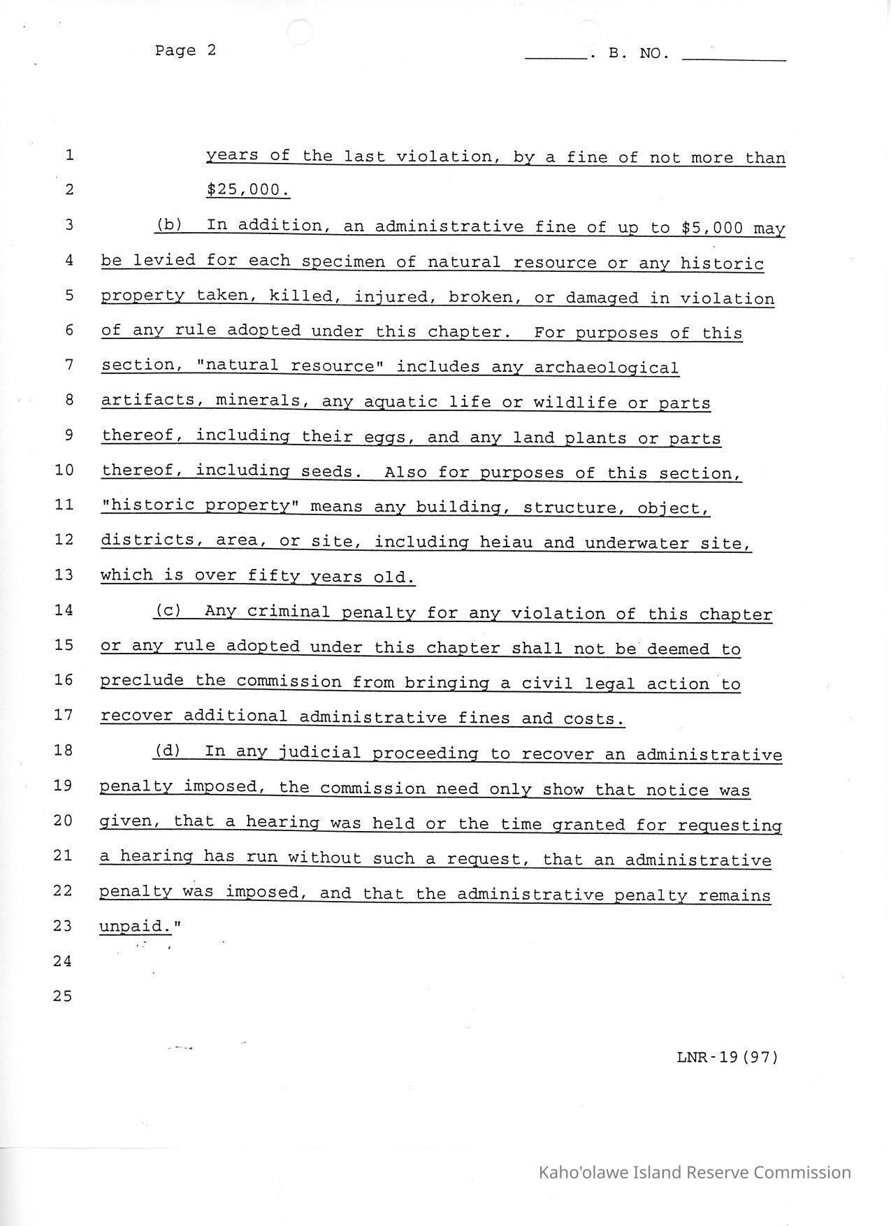 Bill for an Act, Relating to Kaho'olawe Penalties. "Final" typed at top of first page. Footer LNR-19 (97).Container