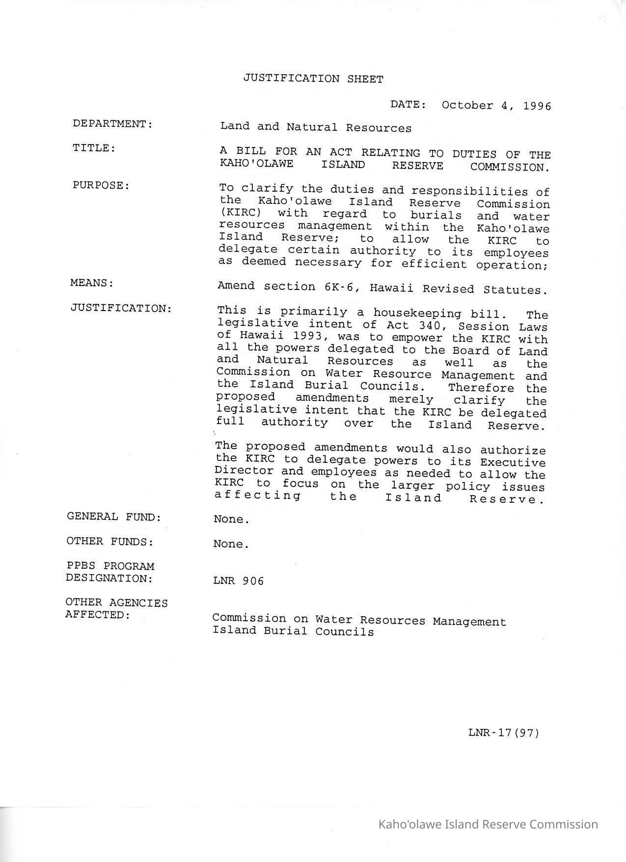 A Bill for an Act Relating to the Kaho'olawe Island Reserve Commission with no number on it. According to the accompanying justification sheet the bill clarifies the duties and responsibilities of the Kaho'olawe Island Reserve Commission (KIRC) with regard to burials and water resources management within the Kaho'olawe Island Reserve; to allow the KIRC to delegate certain authority to its employees as deemed necessary for efficient operation.Collection