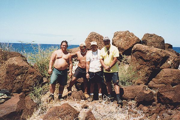 Color photo of a group of four men (left to right: Mark Tsuha, unknown, unknown, unknown) standing in front of a grouping of pohaku (rocks), possibly near Kuhike'e Ahu (the start compass area) in Kealaikahiki.Collection