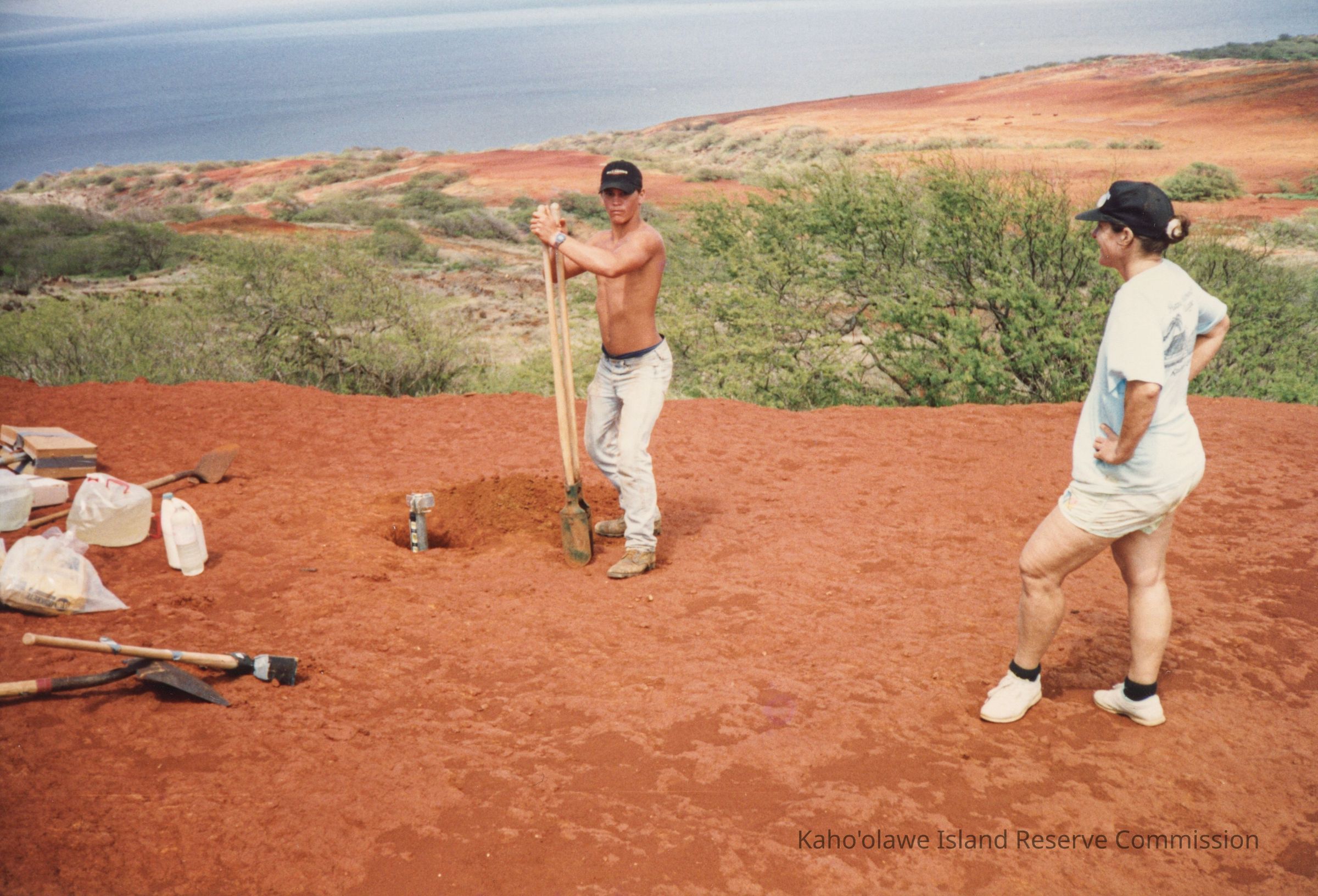 Color photograph of an unidentified person wahine (woman) watching an unidentified kāne (man) holding a pot-hole digger next to a stake on hardpan terrain. They are next to a piece of scientific equipment. Bags and bottles are to the left.