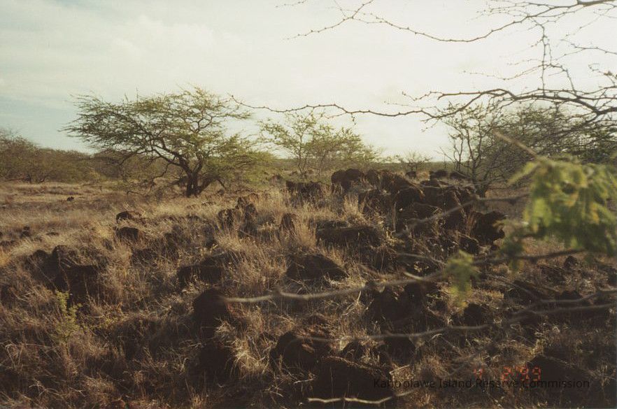 Photo of large group of stones, possibly an archaeological site, with kiawe trees.Photograph Details