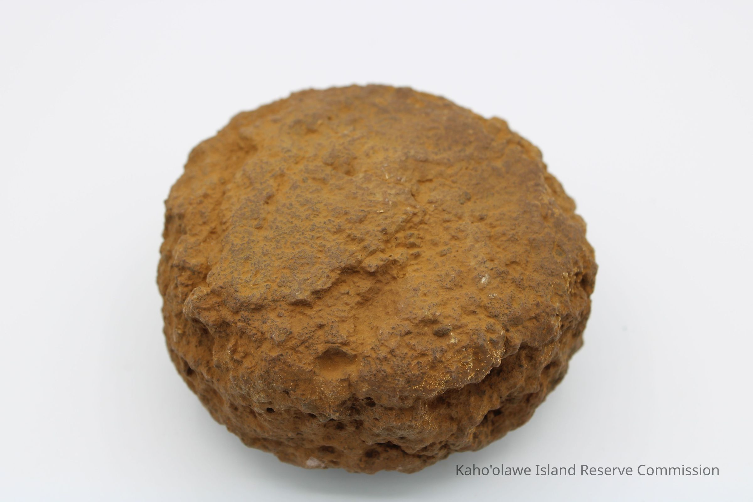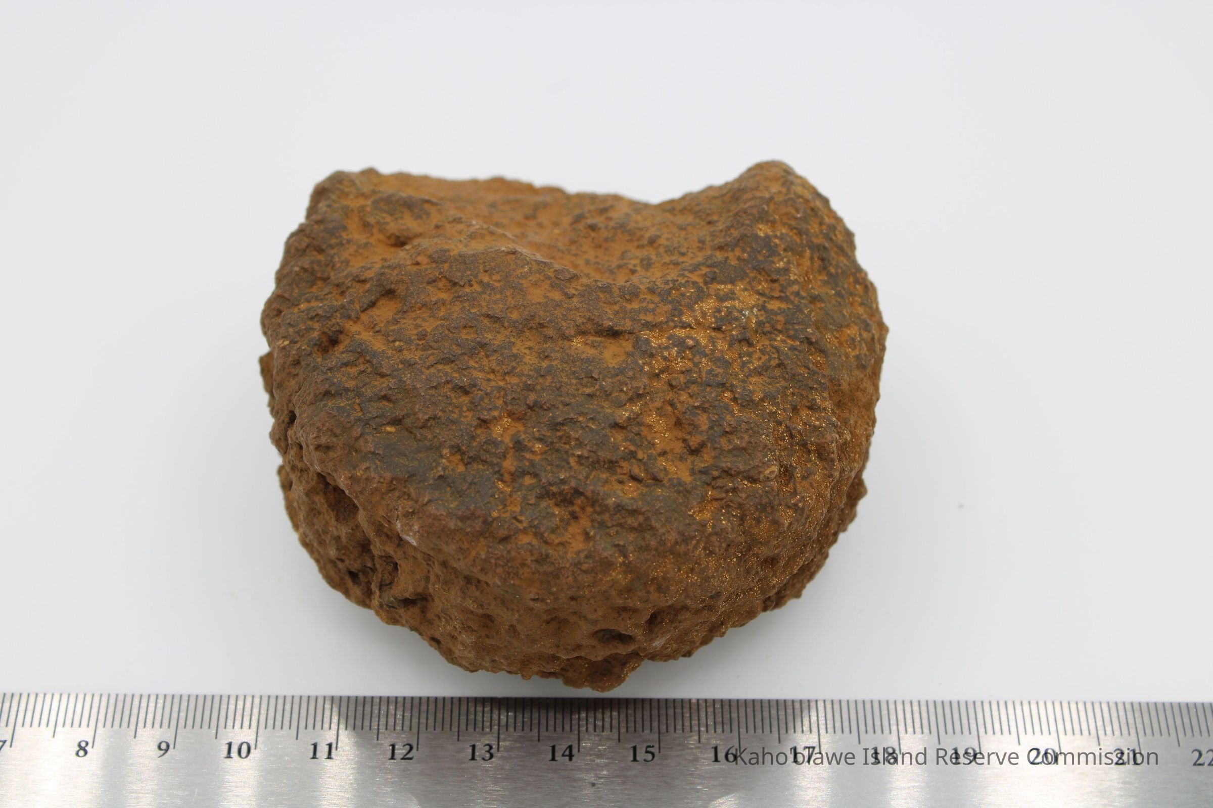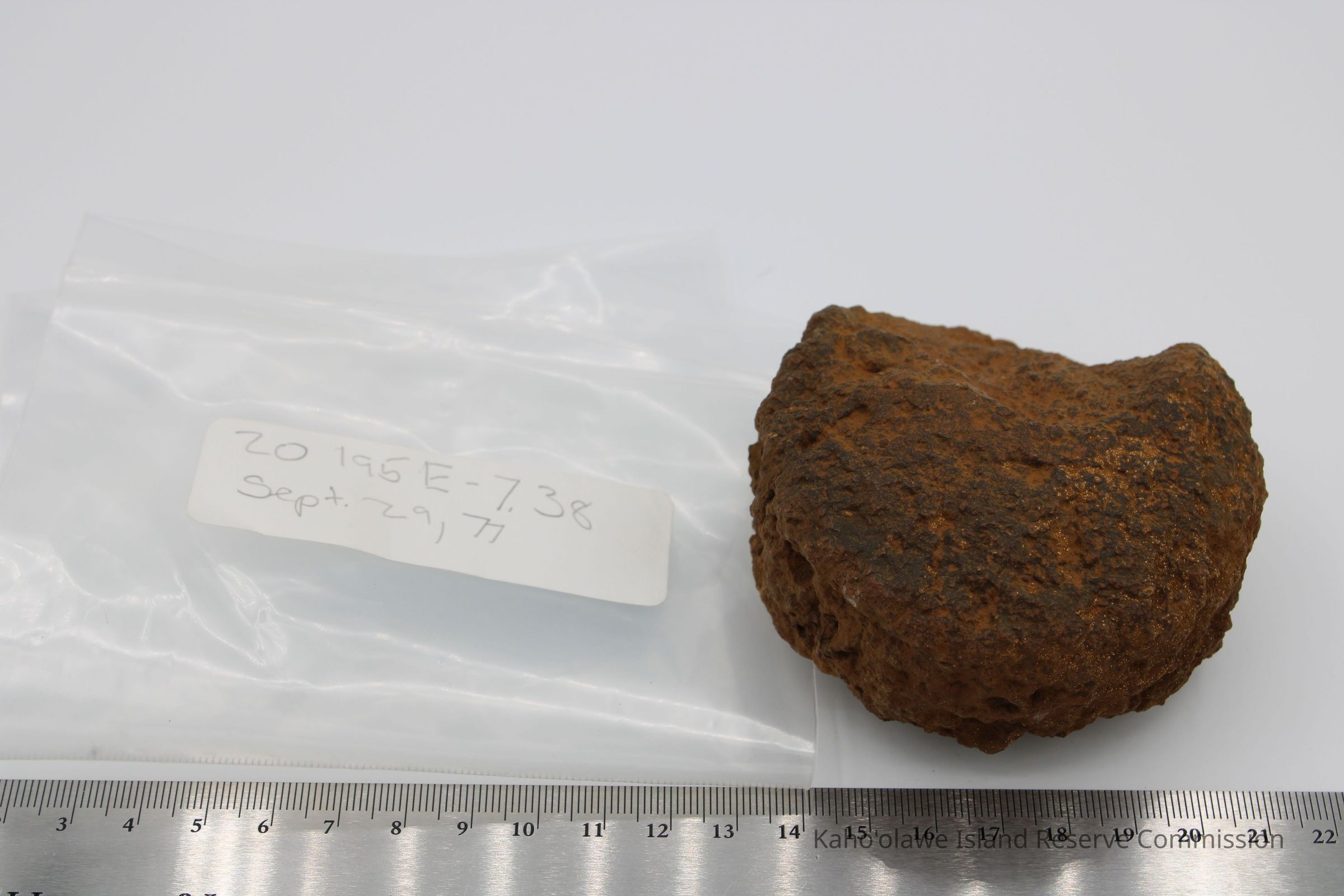 The image shows a rust-colored, rough-textured 'ulu maika stone next to a labeled plastic bag and a ruler.