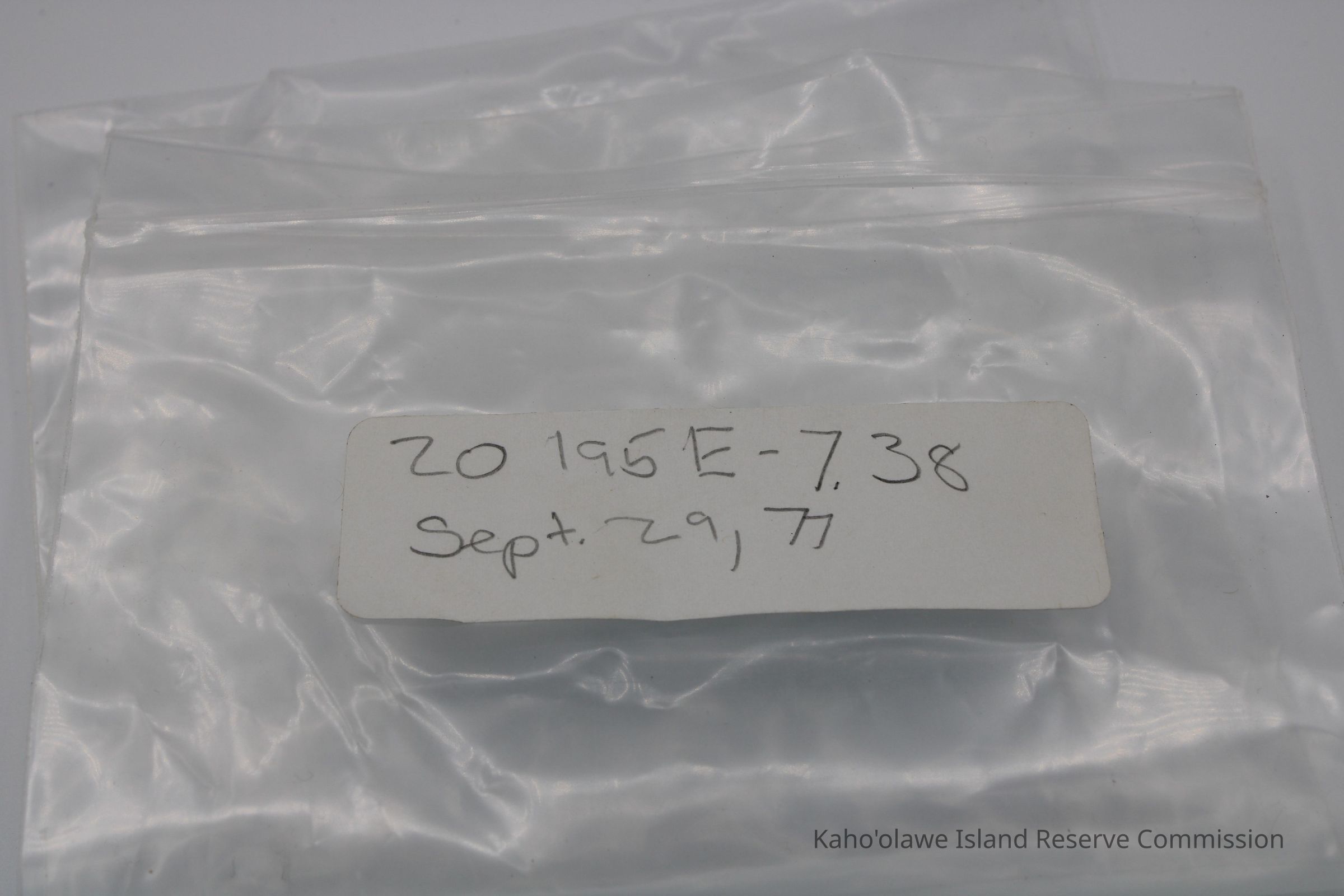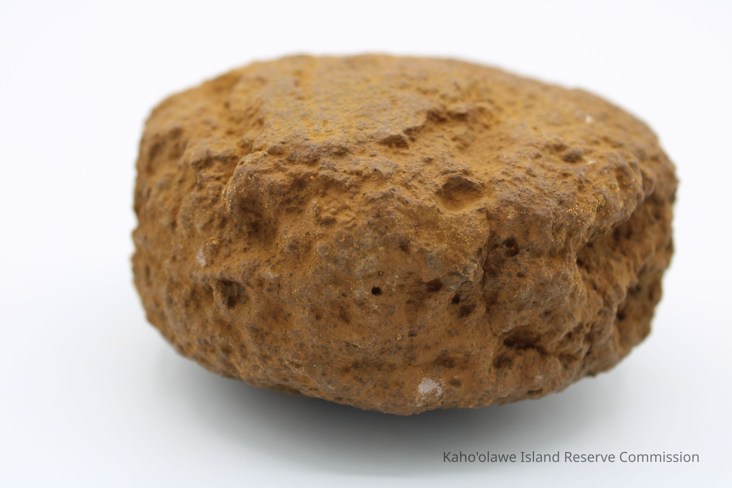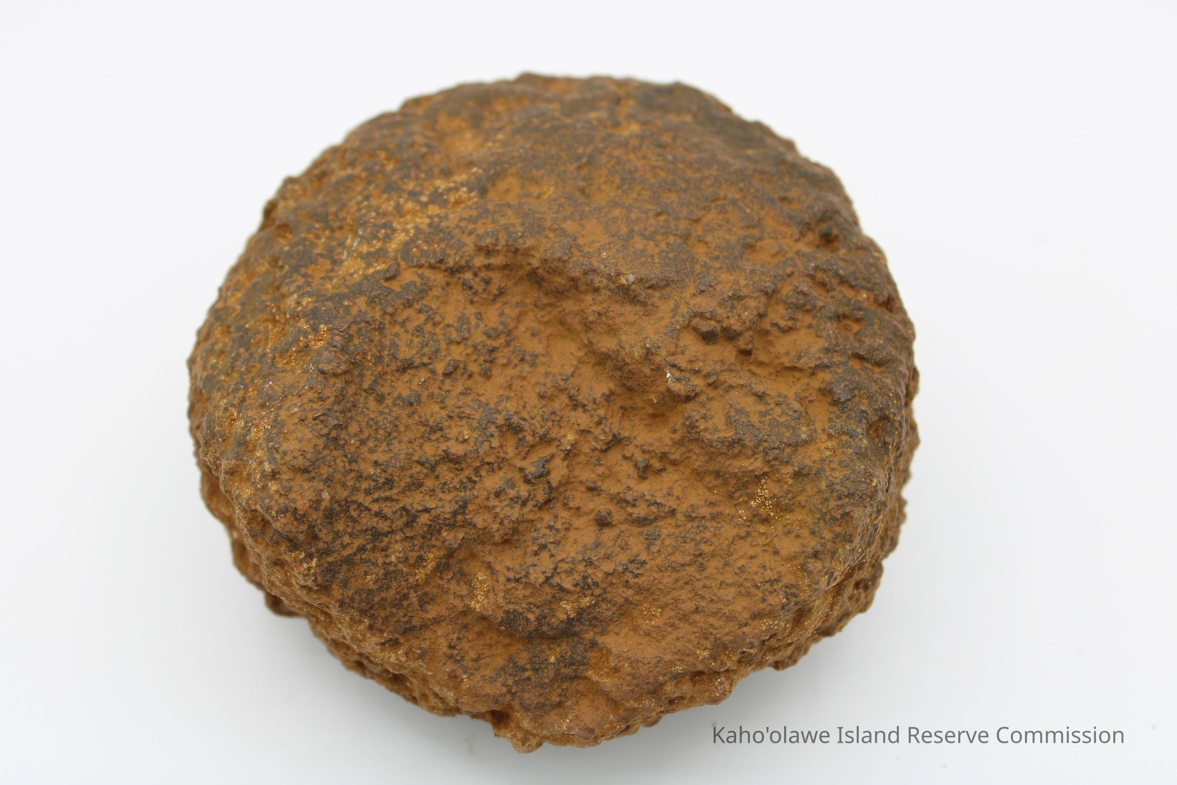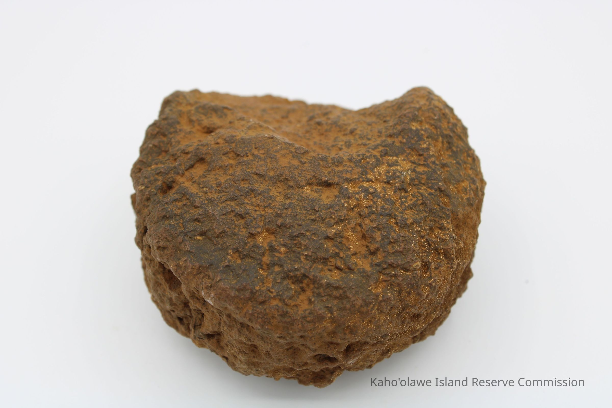 The image shows a rust-colored, rough-textured 'ulu maika stone next to a labeled plastic bag and a ruler.