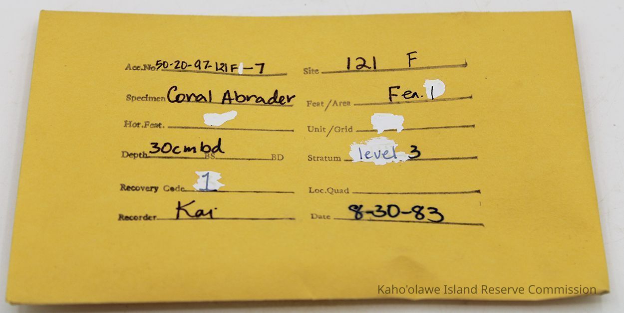 Archaeology, Artifacts, Cultural Resources, Marine, abrader, Activity area, Ahupu 'Ili, Ahupu Iki Gulch, Ahupuiki Gulch, Archaeological sites, Archaeology, coral, Cultural Resources, deposit site, marine resources, North Coast Work Area, Site 121, Site 121F, tools, Artifacts, Cultural resources, Marine resources