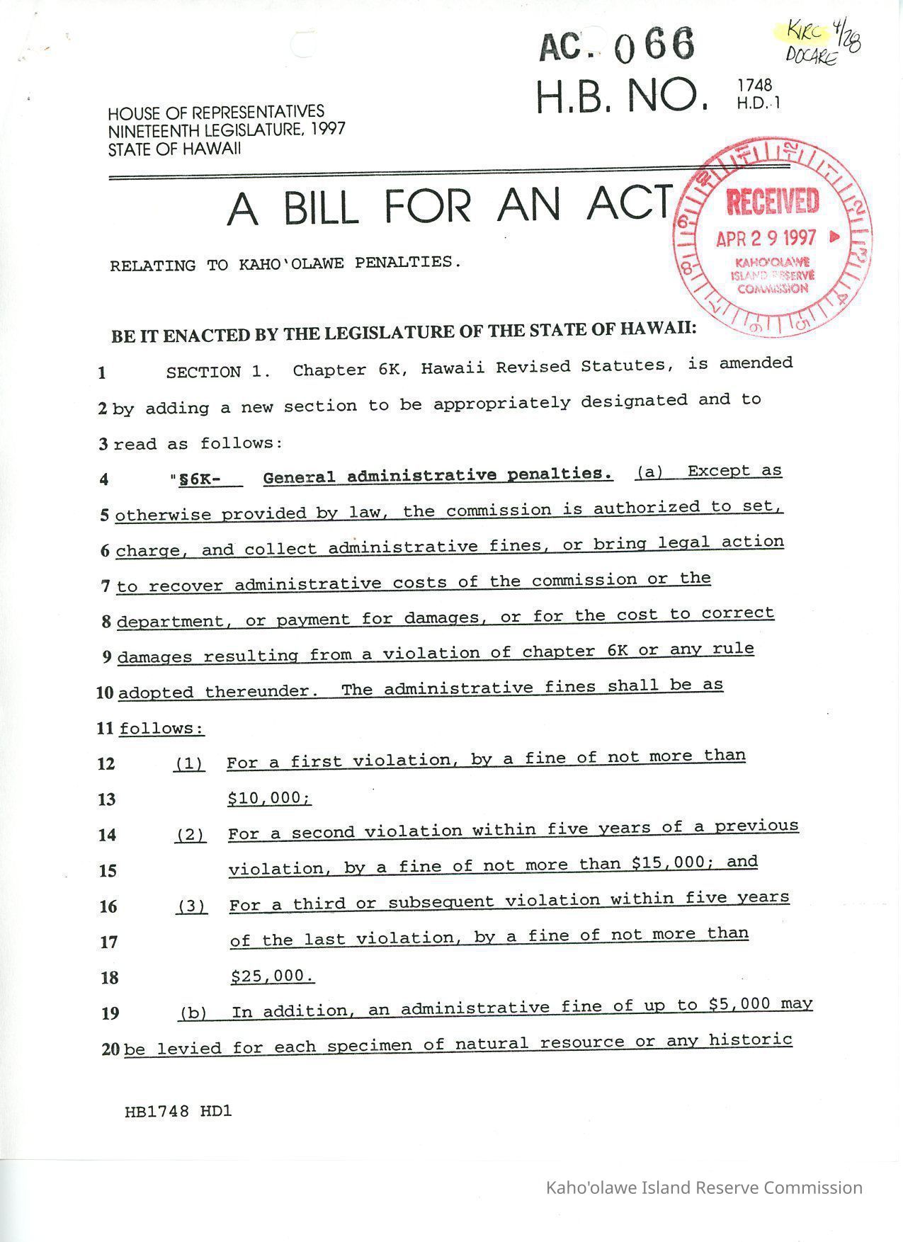 A Bill for an Act, House Bill. No. 1748, House Draft 1, stamped Act 066, Relating to Kaho'olawe Penalties. Stamped "Approved by the Governor on April 23, 1997." Abstract: 1st violation: fine of not more than $10,0002nd violation w/in 5 years of previous violation: a fine of not more than $15, 0003rd violation w/in 5 years of last violation: fine of not more than $25,000.
