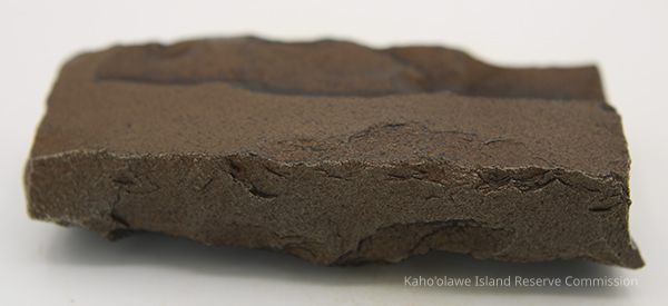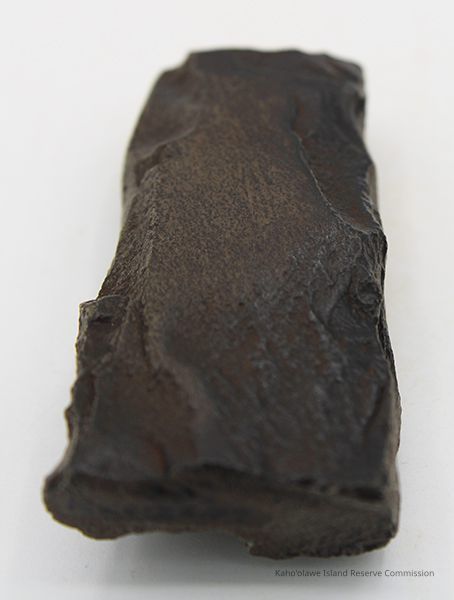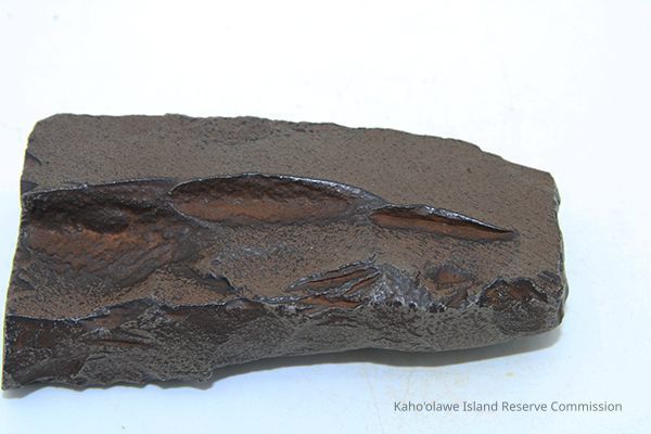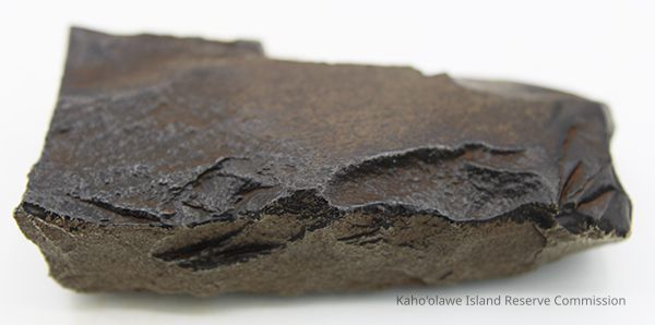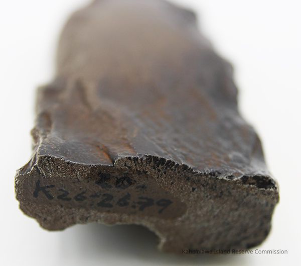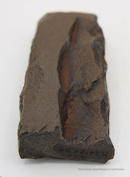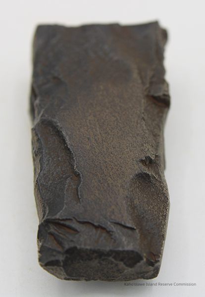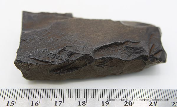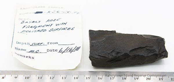 The image shows a dark basalt adze fragment with polished surfaces placed next to a labeled form, alongside a ruler for size reference.