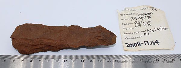 Closeup of adze preform with ruler: Origsize: 12 cm (L) x 4 cm (W); Origformat: Artifact; Resolution: 200 dpi