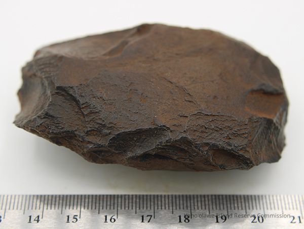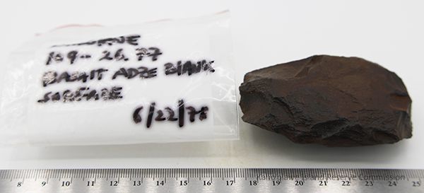 Basalt adze blank with artifact bag and ruler