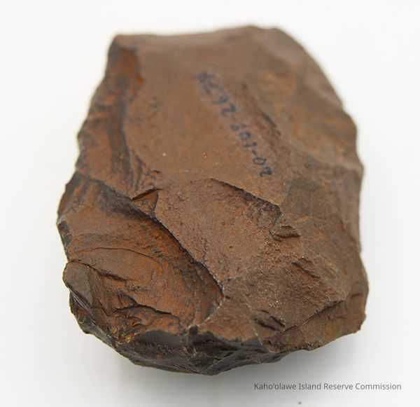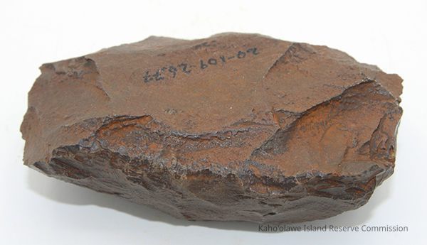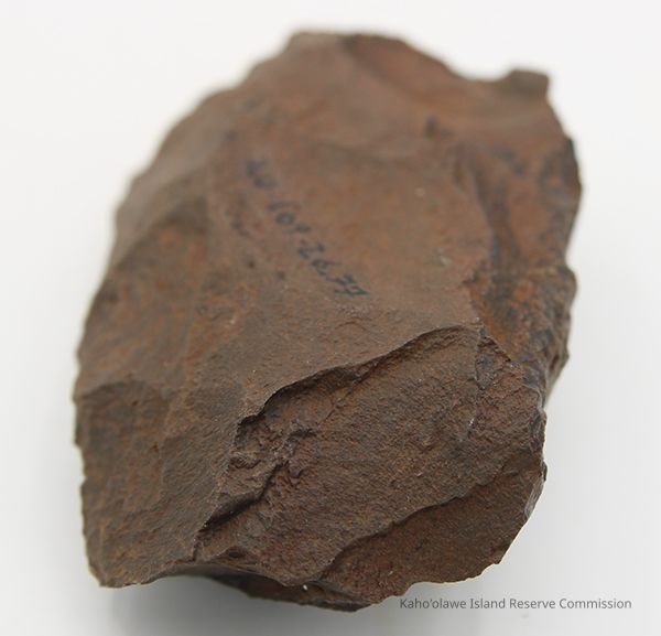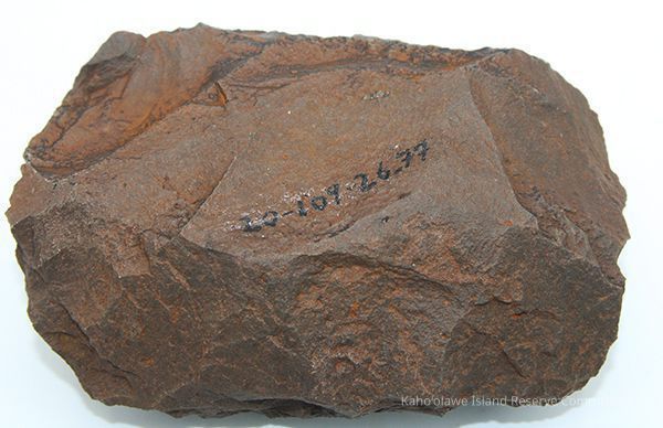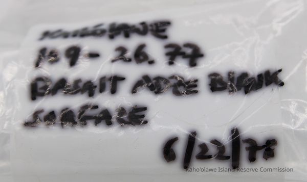 Basalt adze blank with alternate id number handwritten in black ink on one side
