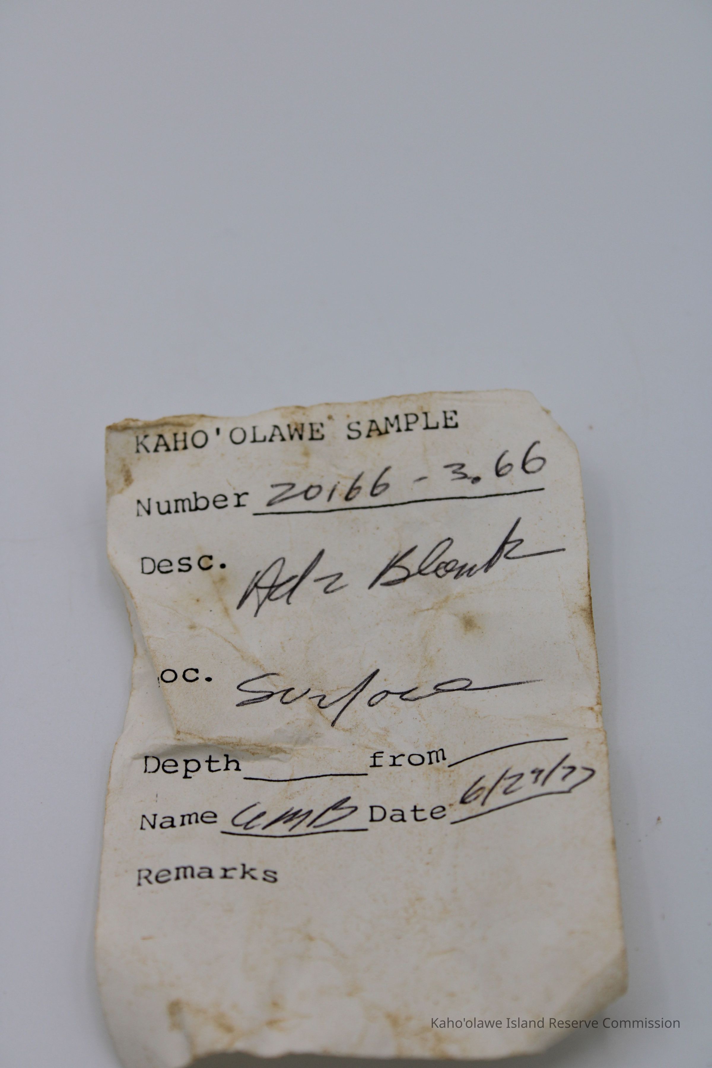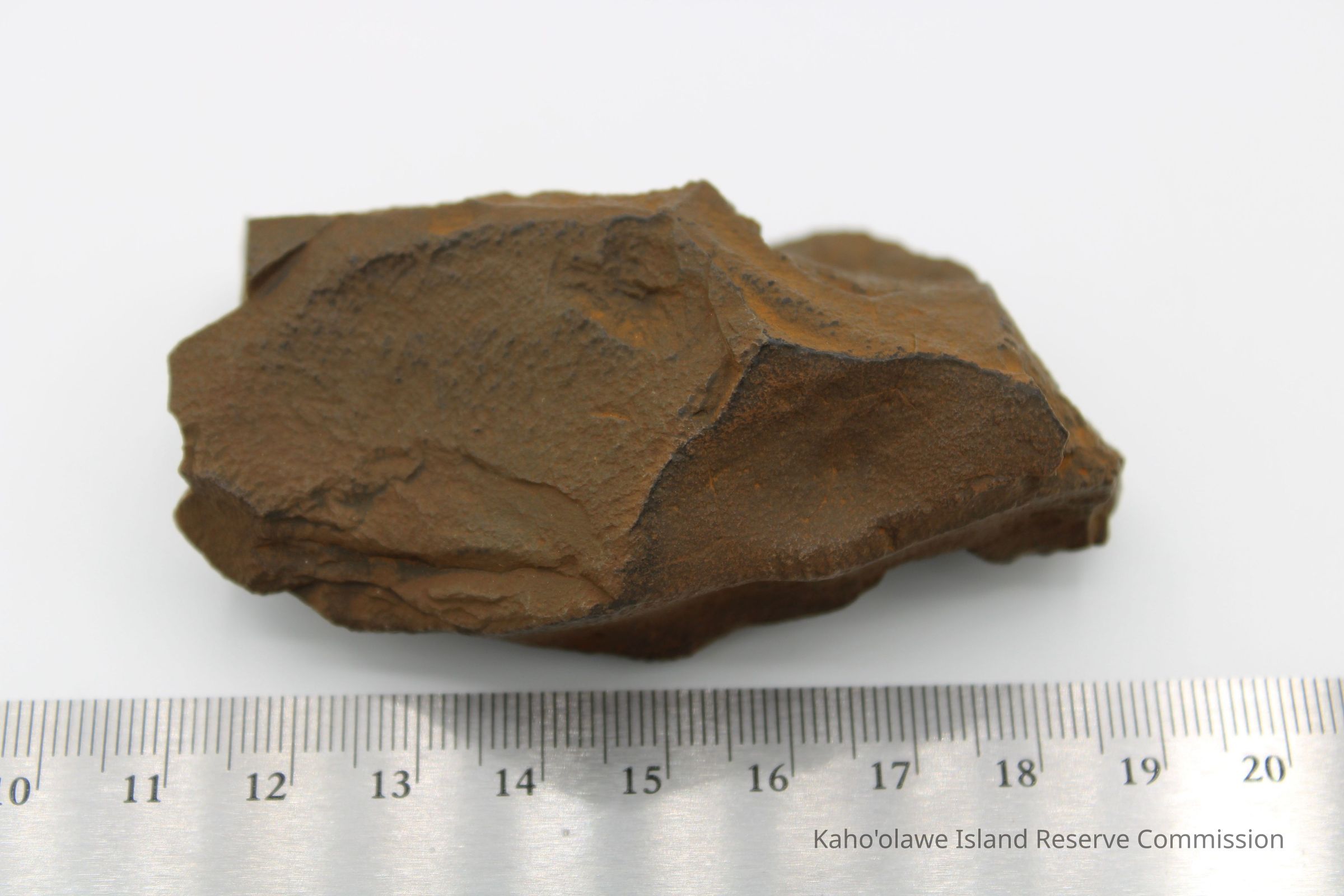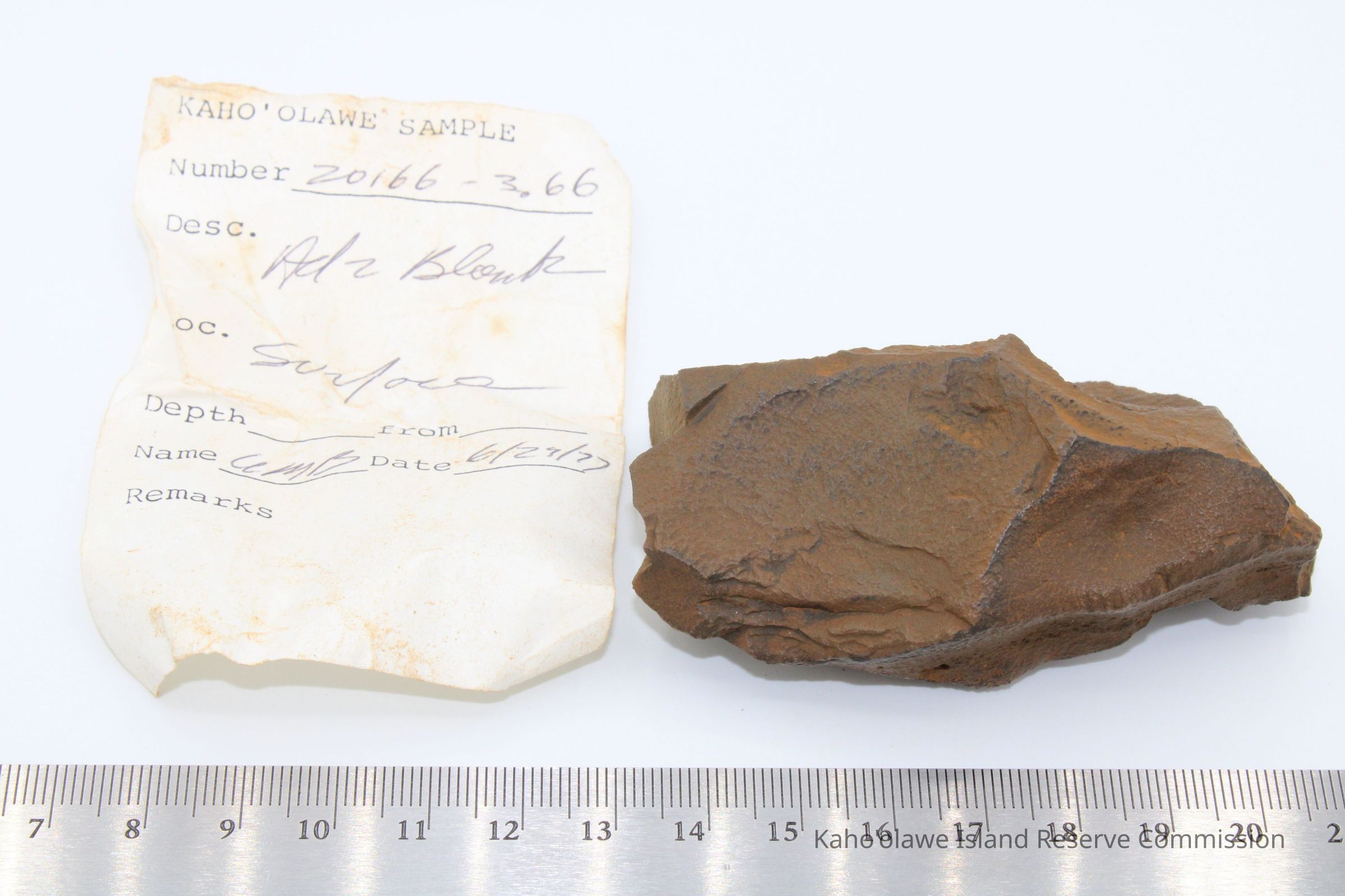 Adze blank next to artifact slip above a ruler: An adze blank with a labeled artifact slip lies beside a ruler, indicating its size and providing contextual information.