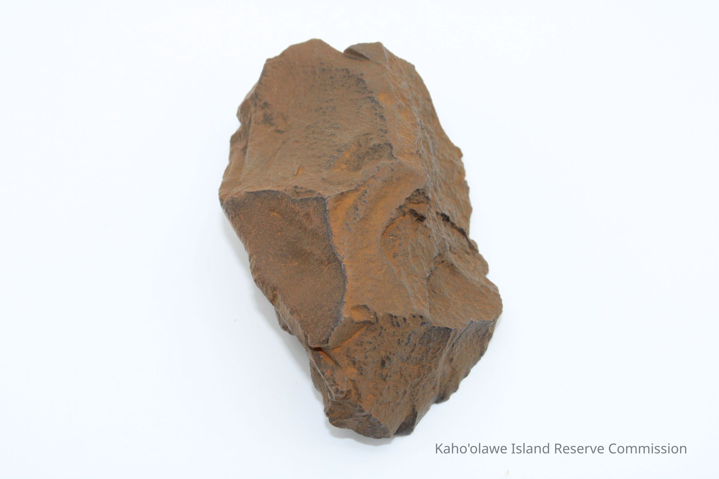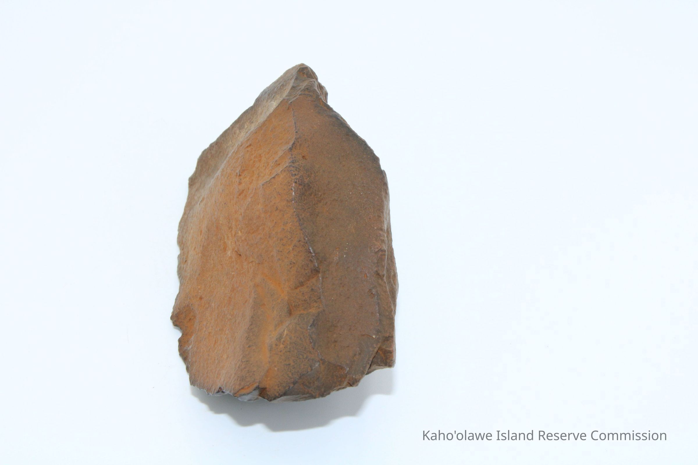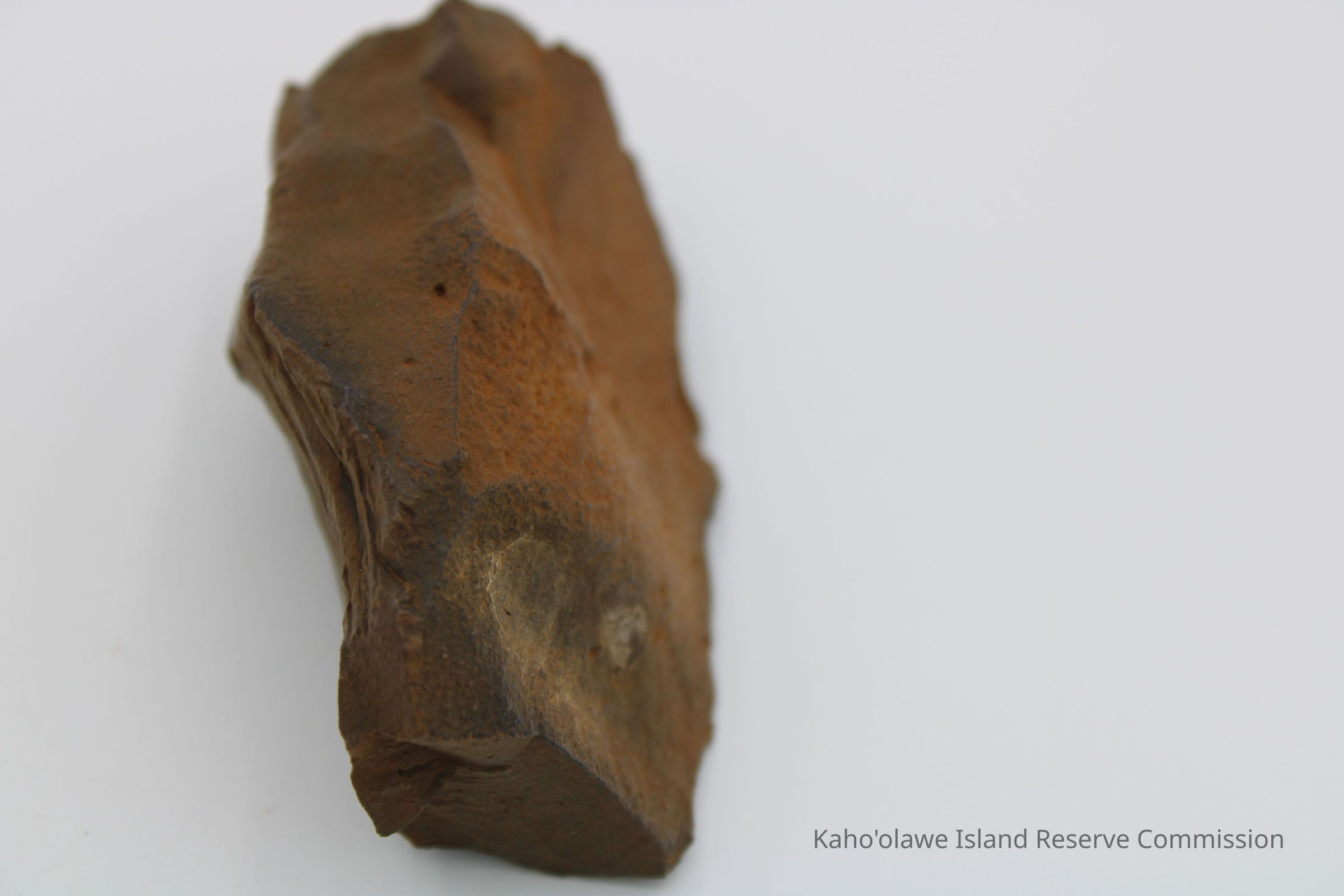 An adze blank with a labeled artifact slip lies beside a ruler, indicating its size and providing contextual information.