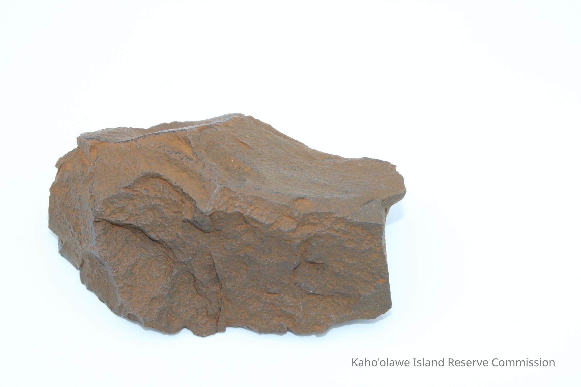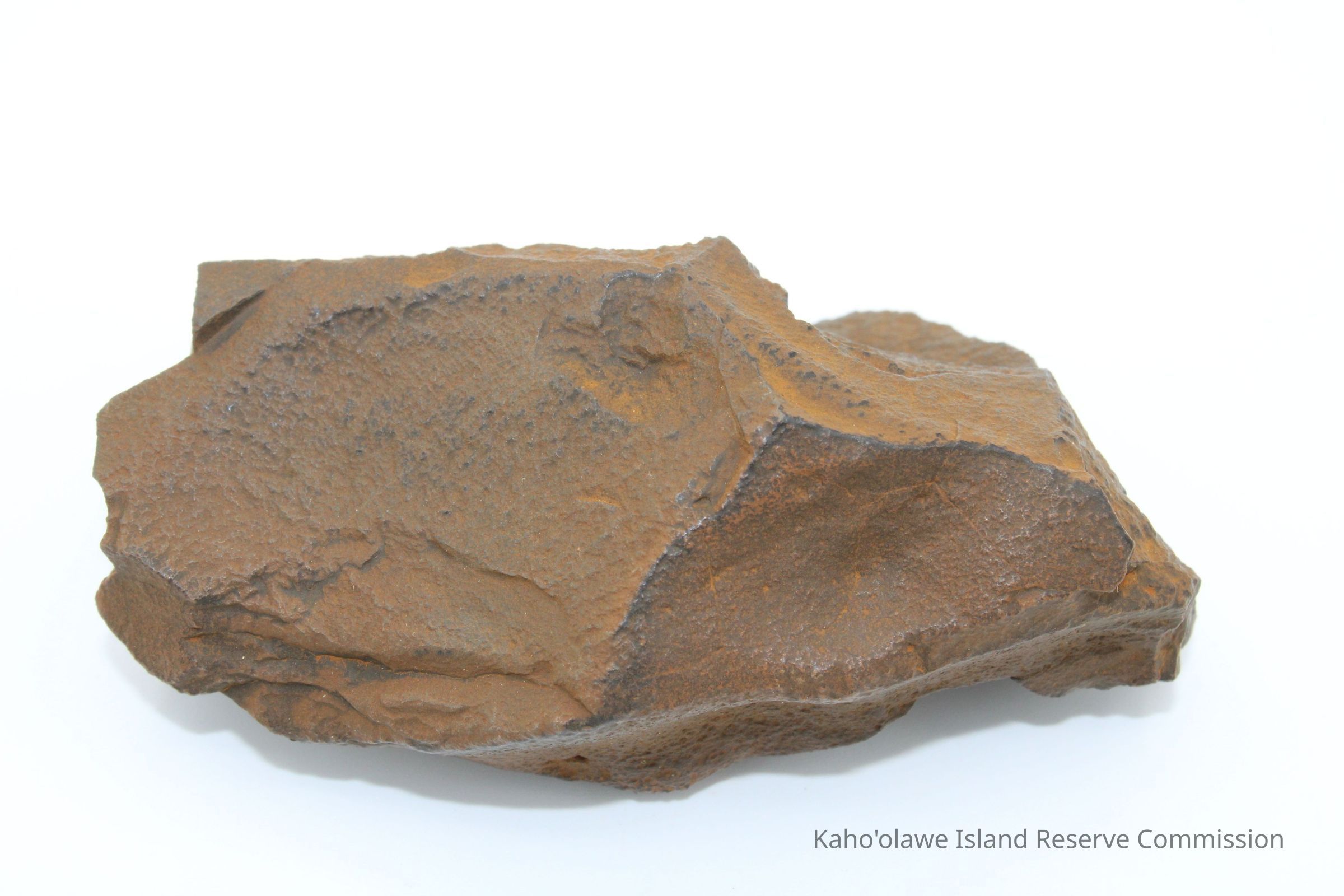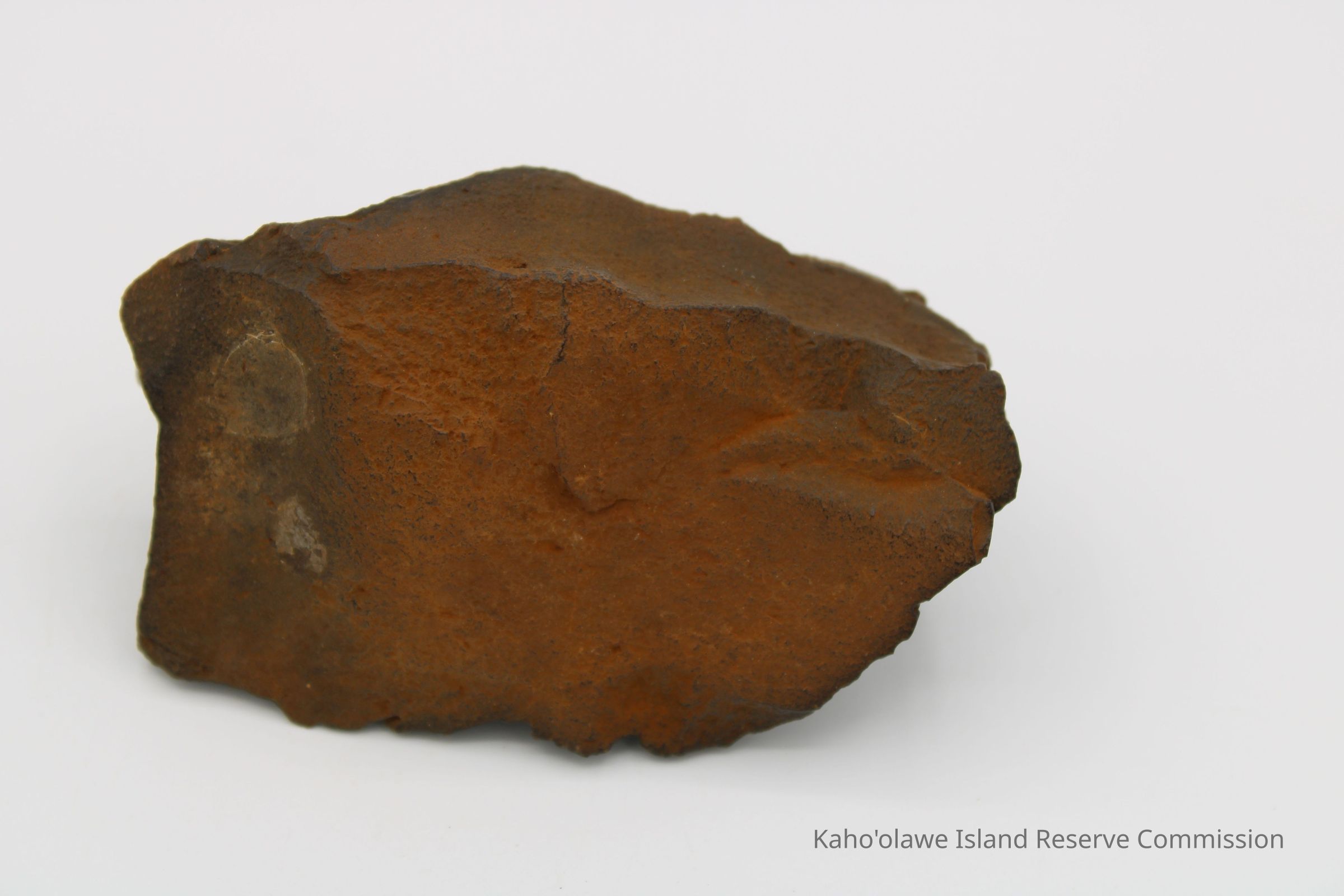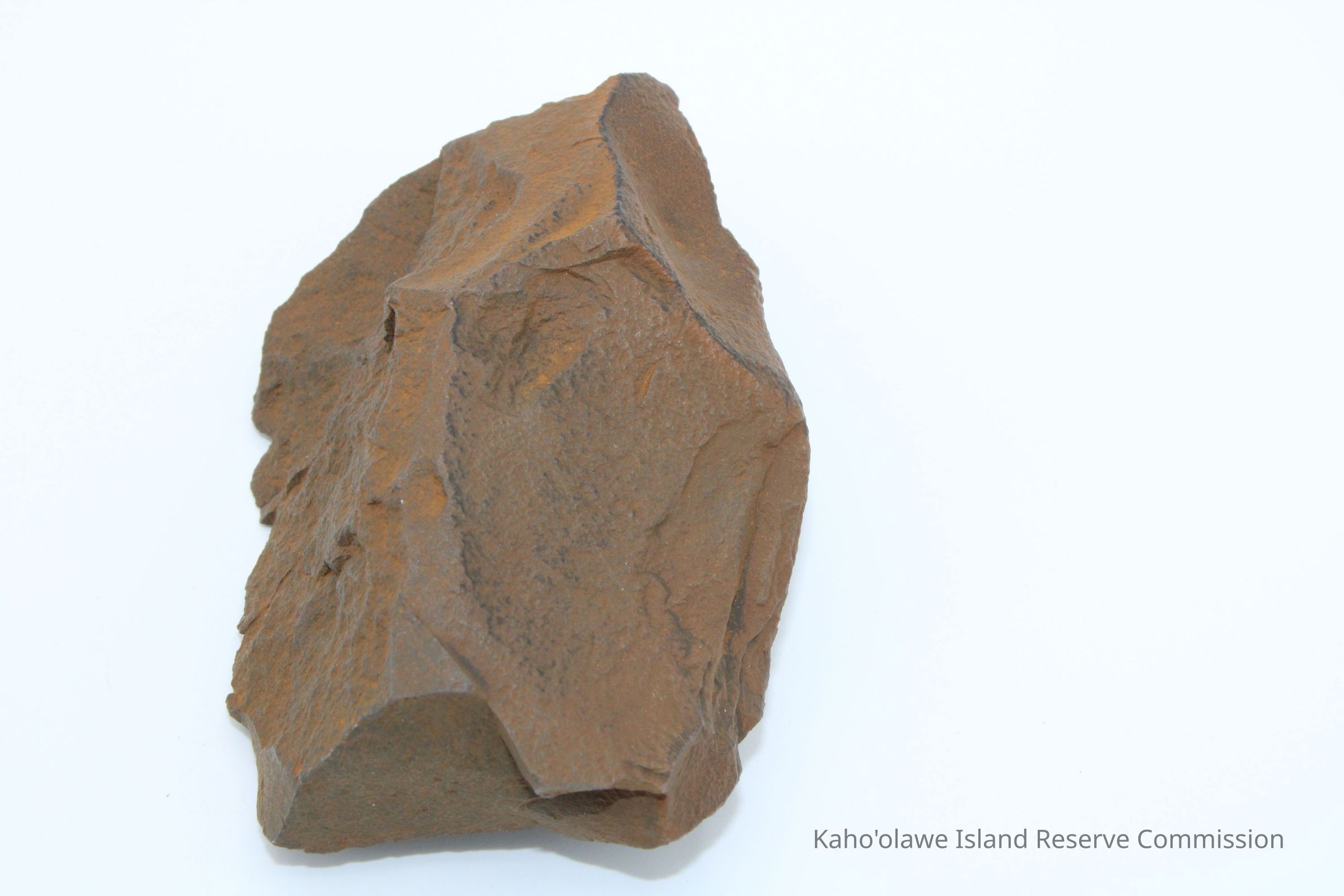 An adze blank with a labeled artifact slip lies beside a ruler, indicating its size and providing contextual information.