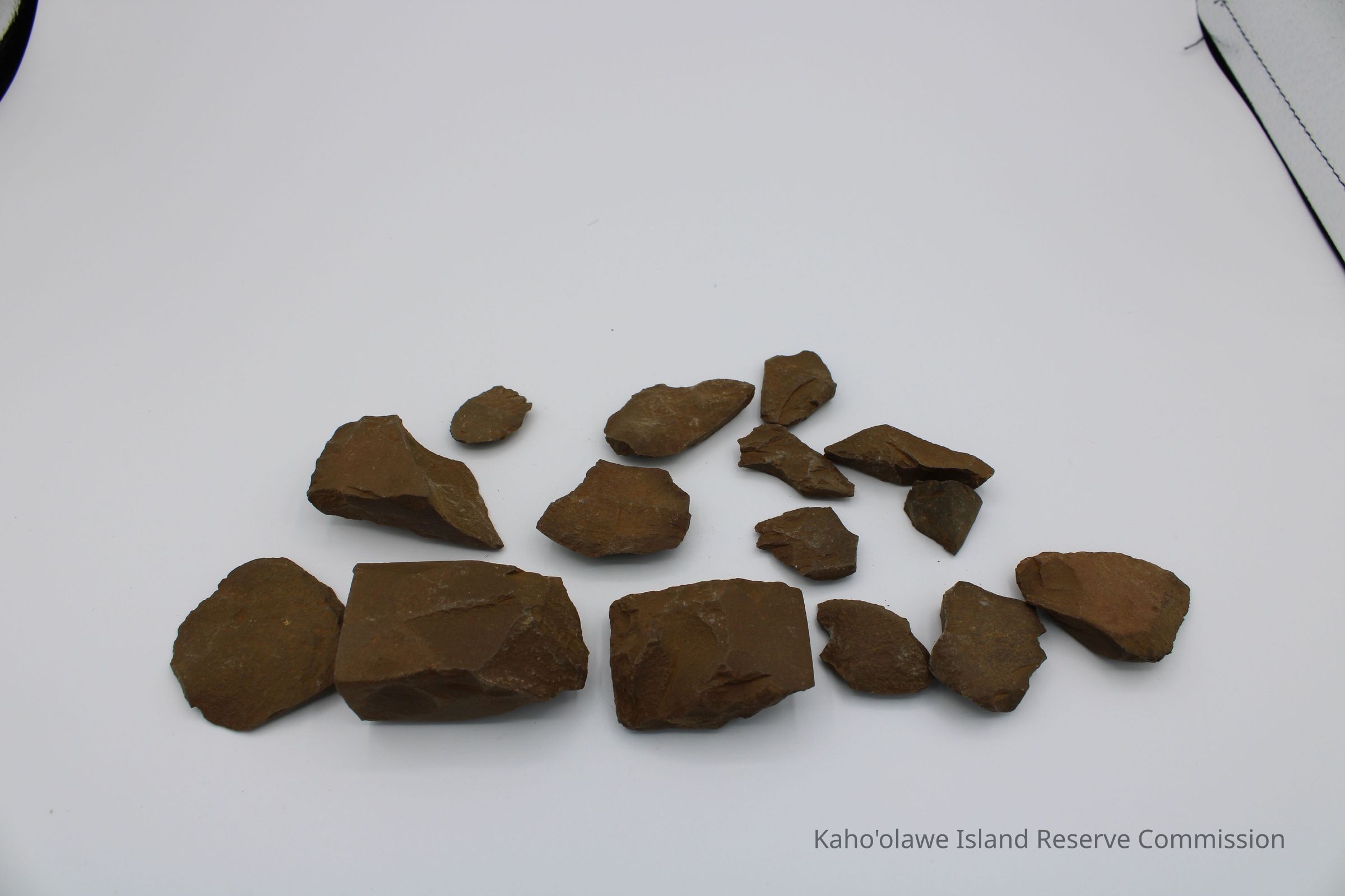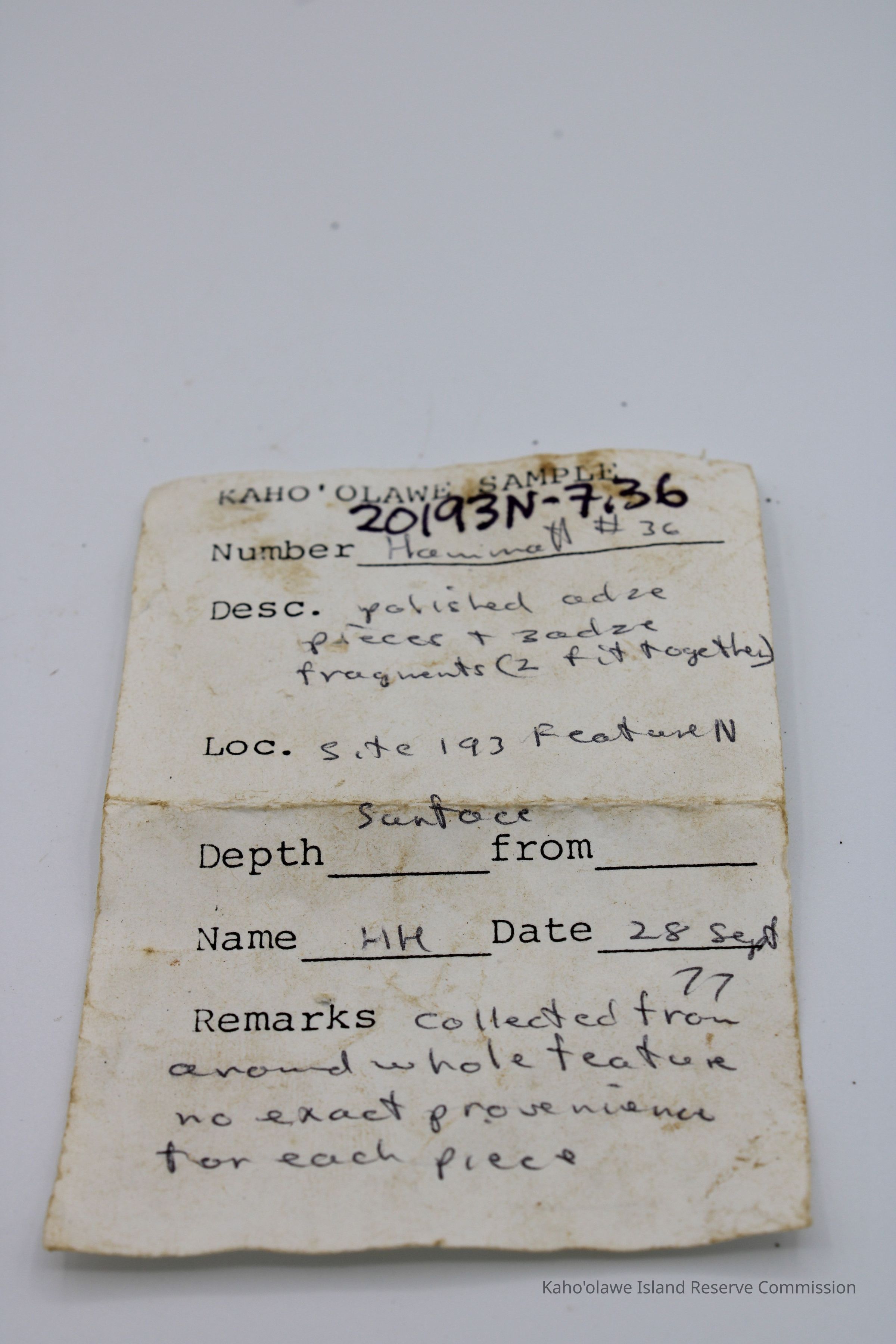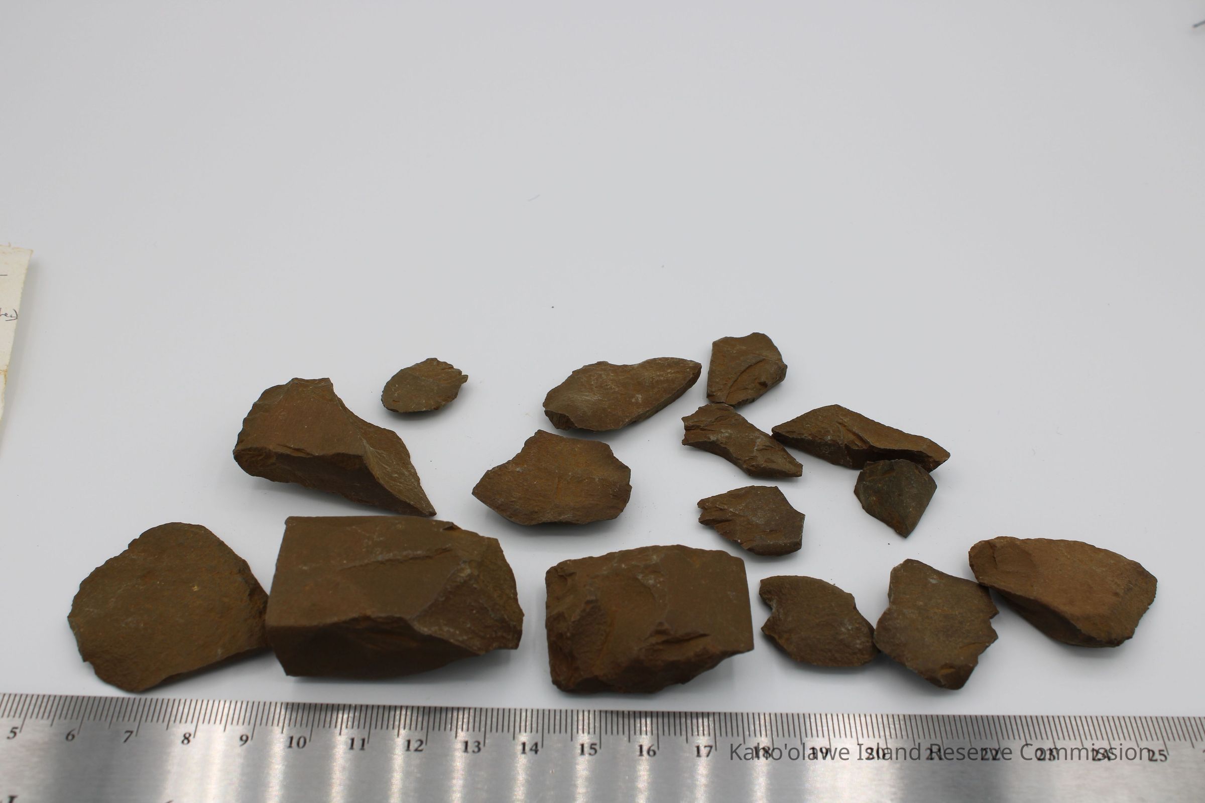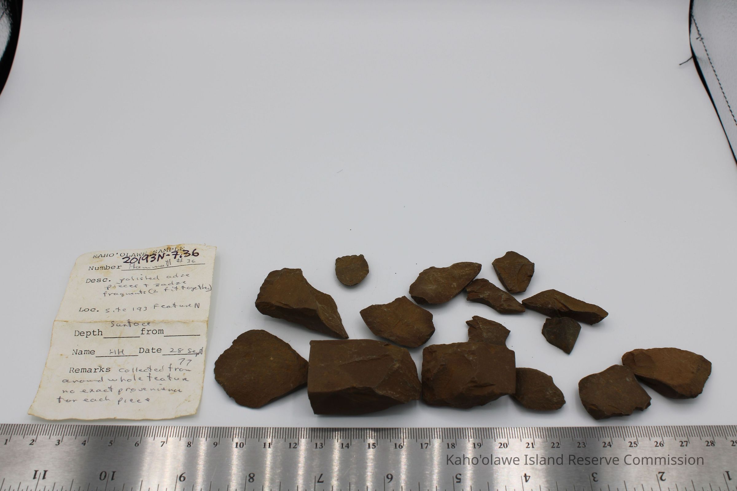 Polished adze pieces and adze fragments--2 fit together. These were collected from around the whole feature, no exact provenance for each piece.Collection