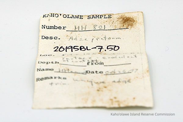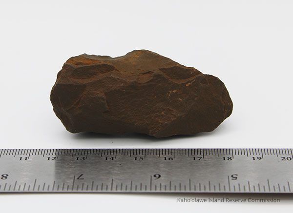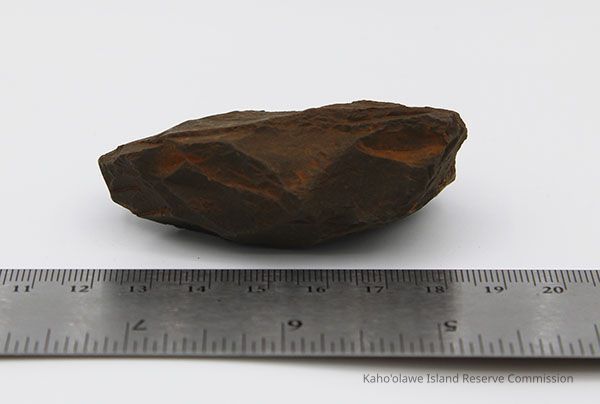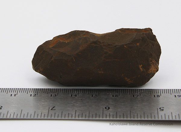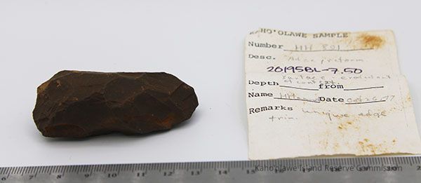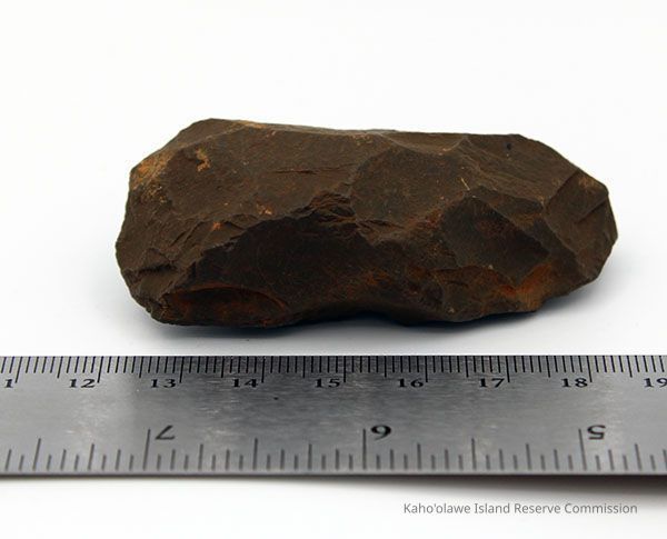 The image depicts a rough, brown adze preform placed beside a ruler, showcasing its approximate length of 6 centimeters.