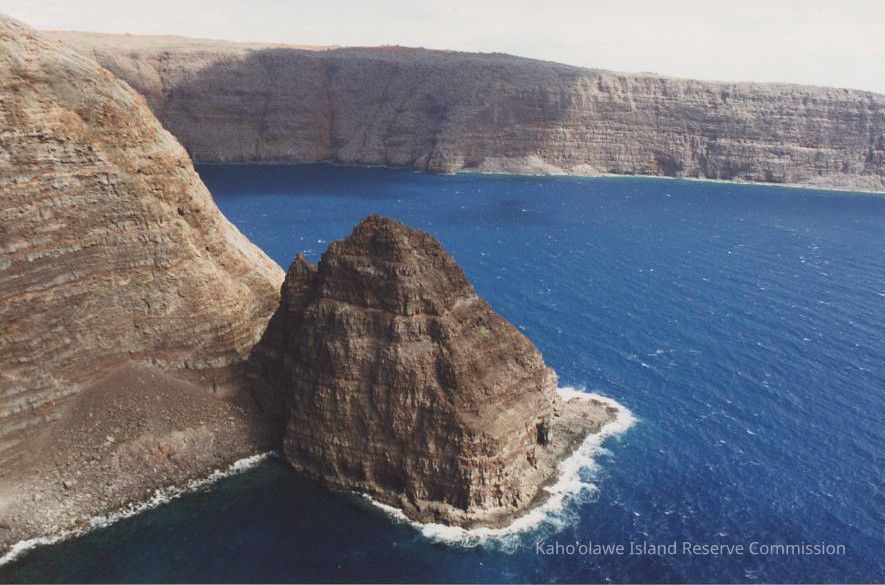 The image shows a rugged coastline with steep cliffs overlooking a deep blue sea, featuring a prominent rocky outcrop near the shore.