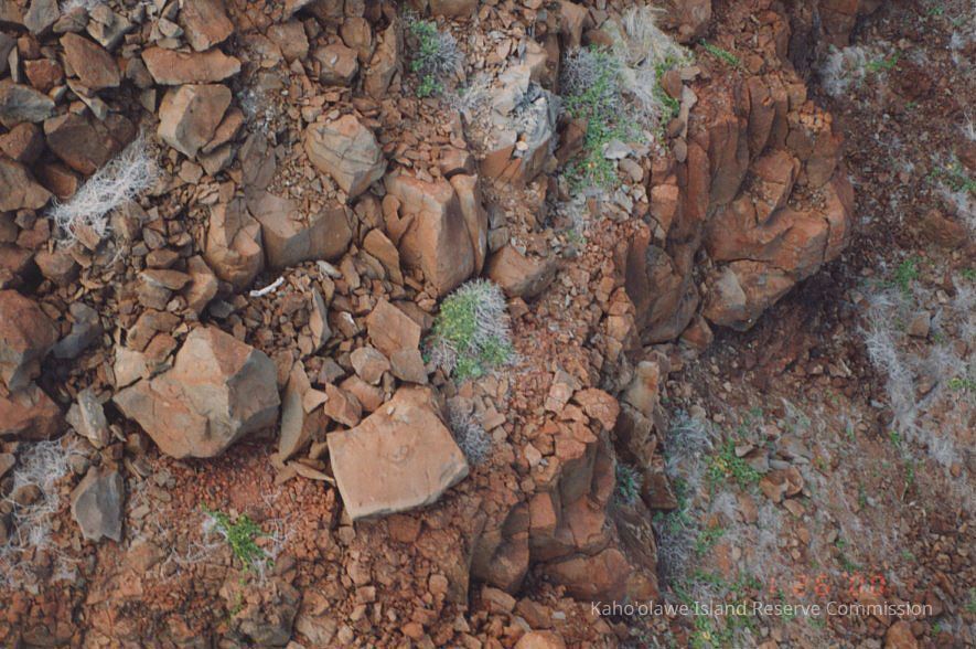 The image captures a rugged, rocky terrain featuring large red-brown stones and sparse vegetation, viewed from above.