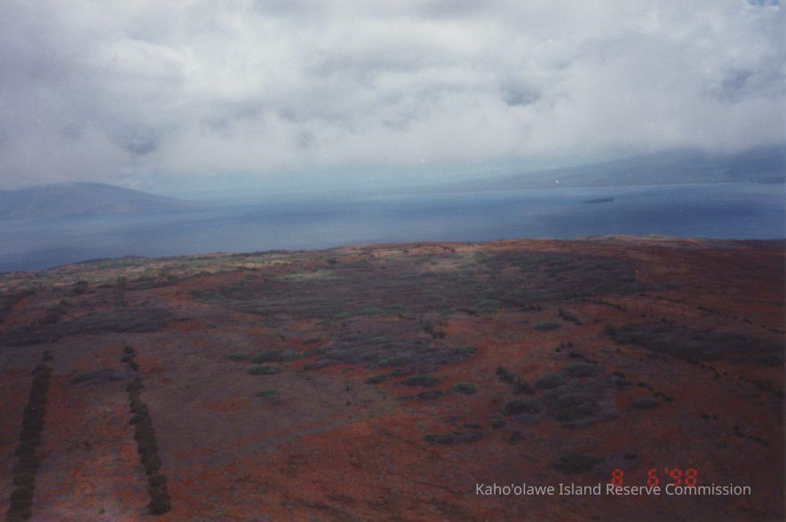 A high altitude aerial photo facing Luamakika taken from west of the southern slope (of Pu'u 'O Moa'ula Iki?) with Maui and Molokini in the background.Photograph Details