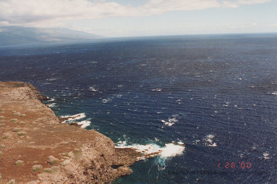An aerial photo of the Lae 'O Kaka coastline and part of Haleakalā in the background.